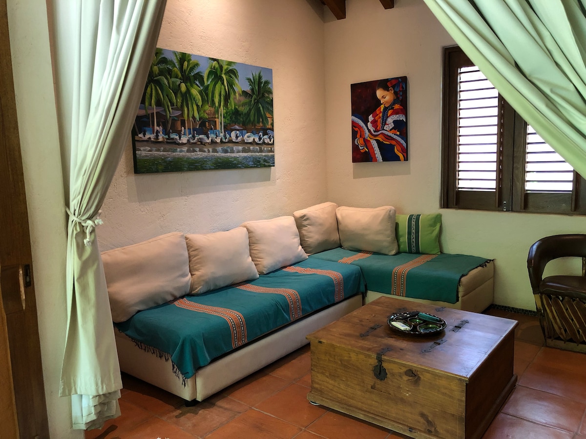 bonito departamento de una recamaran y estancia, servicio de internet, tv, aire acondicionado, cocineta, 1 cama matrimonial y un sofa cama matrimonial ideal para parejas o matrimonios con 2 hijos menores de 12 años perfectamente acomodados o maximo 3 adultos, el lugar se encuentra a 1/2 cuadra de la playa y 5 minutos del centro caminando, a dos pasos de restaurantes cafeterias