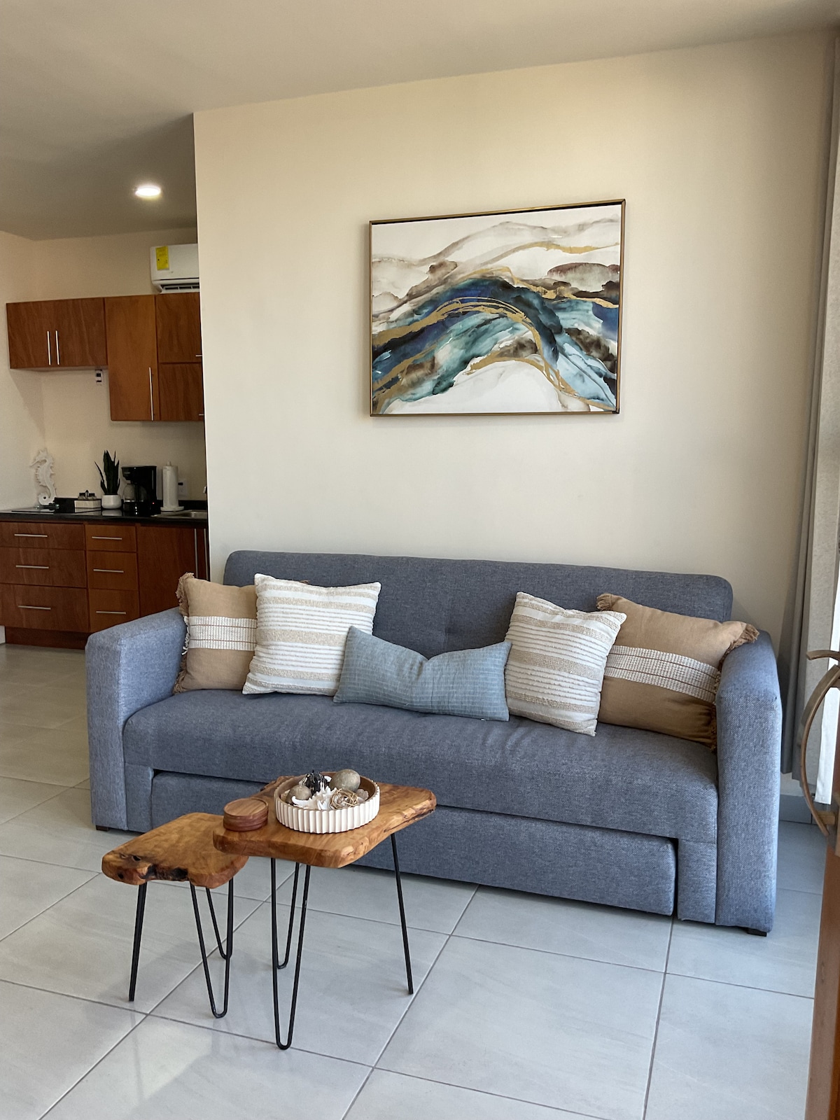 Spectacular oceanfront condo with the best beach sunsets. Close to beach restaurants and outdoor activities. Enjoy this Modern beach condo with two bedrooms, two bathrooms, living room, dinning area, kitchen, WiFi, Tv, pool, and a beautiful terrace to enjoy the best sunsets.