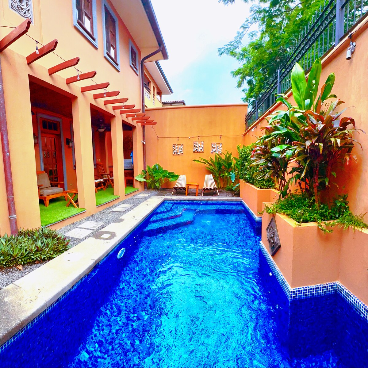 Beautiful 3 bedroom guest house within a gated development of Hacienda Pinilla and located in the exclusive beachfront private community of Avellanas,just steps from Avellanas beach.Quiet,calm and only 15 minutes from Tamarindo beach town. Plumeria Guest house is a two level,three bedroom home with full A/C uniquely designed to feel submerged in nature while being only 60 feet from the beach and close distance to surf breaks, Lola’s and Beachclub