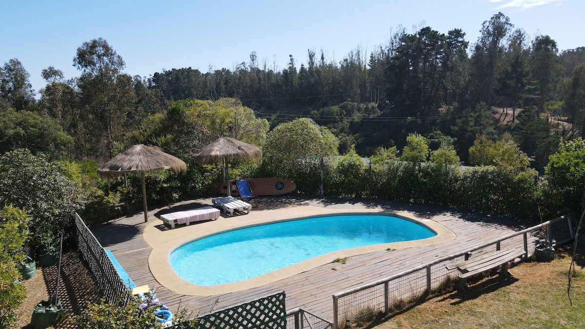 hermoso lugar en el centro del campo, alejado del ruido urbano, en el amanecer contemplaras el cántico de las aves, gran variedad de vegetación nativa, áreas de treking - bicicletas, 15 minutos de algarrobo-tunquen. Excelente señal telefónica 4G. MÚSICA HASTA LAS 22hrs. CABAÑA CON PISCINA PROPIA Única y exclusiva cabaña con su propia piscina, no tendrás que compartir la piscina con otras personas. La piscina cuenta con un amplio deck y reposeras reclinables