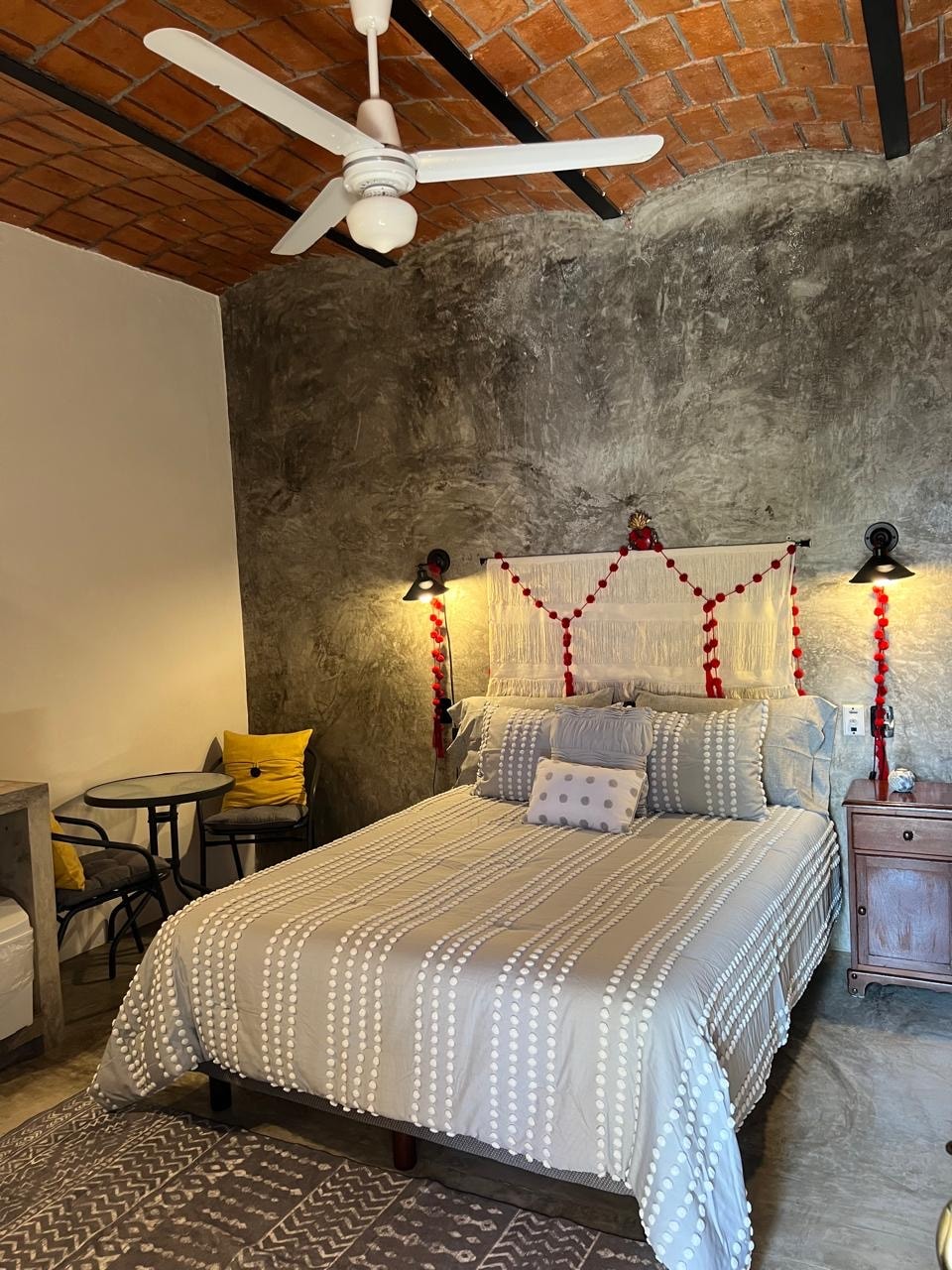 ¡Aire es parte de Casa Calavera, un paraíso tropical en San Francisco, Nayarit! Una propiedad exuberante en un entorno de pueblo. Estamos a solo 5 minutos a pie de la ciudad y a 12 minutos de la hermosa playa. Nuestra azotea cuenta con impresionantes vistas al mar, la montaña y el atardecer. Aire tiene aire acondicionado, cama tamaño king, cocina pequeña, baño y caja fuerte. Disfruta de los espacios compartidos descansando en la piscina de agua salada o viendo la puesta de sol en la azotea. ¡Perfecto para el trabajo a distancia con nuestro wifi rápido! Toda el agua está filtrada y es segura para beber del grifo