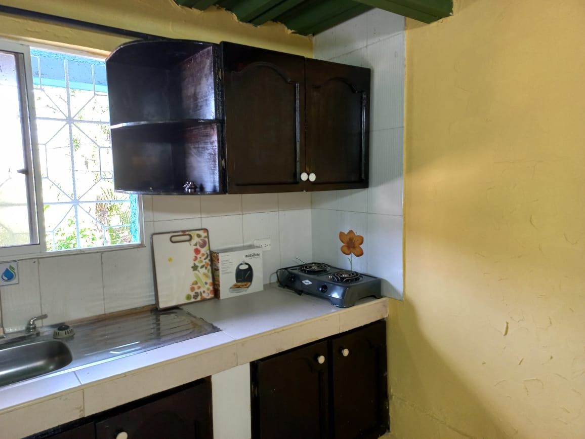 Apartamento acogedor a media cuadra (30 m.) de las mejores playas de San Andrés, en el centro de la isla. Tiene una cama doble, una cama sencilla auxiliar debajo de la doble, cocina integral a gas con todos los utensilios para cocinar y servir, TV con cable, microondas, nevera, aire acondicionado, closet y baño privado. El apartamento posee una ventana pequeña al lado de la cocina que tiene vista al interior del edificio. Área 20 m2