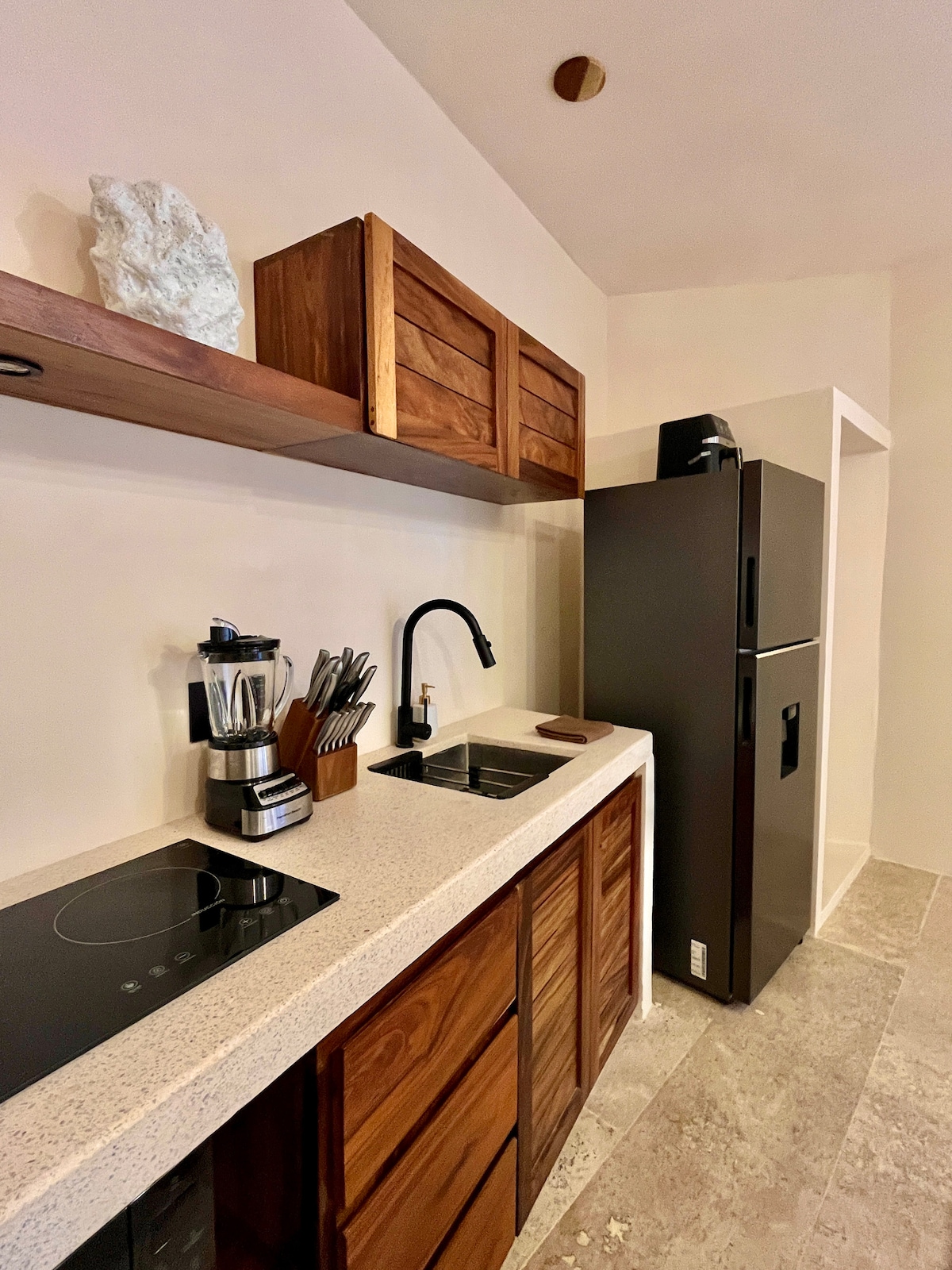 Hermosa y espaciosa suite con cama kingsize, TV giratoria de 50”, Aire acondicionado, cocina, baño y piscina privada. Siente la tranquilidad, relájate en el hidromasaje de tu piscina privada y disfruta de la comodidad de contar con todo lo necesario para una estancia placentera. Nos encontramos en Punta Zicatela, a 7 minutos caminando de la playa, principal punto de surf, restaurantes, bares y zona comercial. Cerca de todo, pero fuera del bullicio de la fiesta. Contamos con Internet Starlink