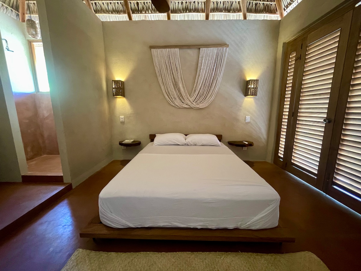 Disfruta de una escapada relajante en esta acogedora cabaña tipo loft con vista al mar. A A solo 7 minutos caminando de la playa, este espacio es ideal para quienes buscan tranquilidad sin alejarse del sonido de las olas. El loft cuenta con una cama king size, aire acondicionado, baño privado con agua caliente, cocina equipada y una terraza perfecta para ver el atardecer o simplemente relajarte con una bebida. Perfecto para parejas que quieren conectar con la naturaleza sin sacrificar comodidad