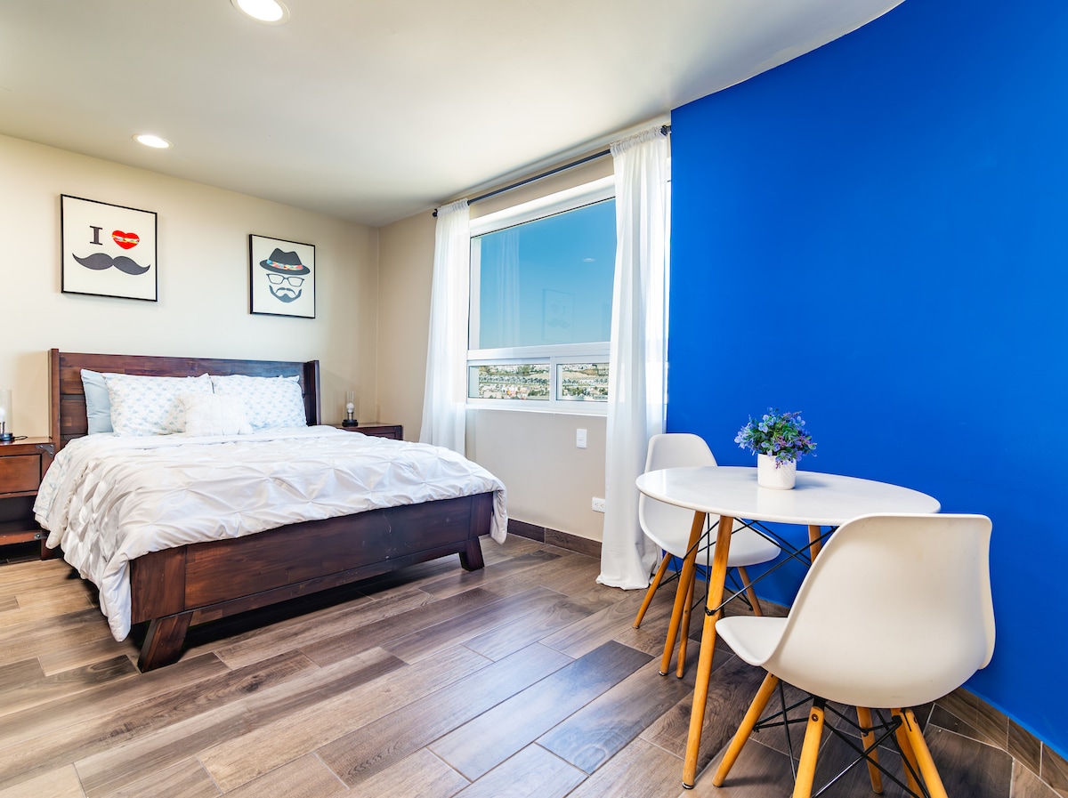 Disfruta de una experiencia con estilo en este alojamiento ubicado a 10 min del cruce internacional en auto, a 10 min de la zona turística caminando. Con vistas al centro de Tijuana. Cercano a cafés y restaurantes de la zona. Cómodo y seguro para caminar, con seguridad interna las 24 horas. El departamento cuenta con dos balcones y excelente iluminación, ventanas de piso a techo con persianas blackout para más control de la iluminación.