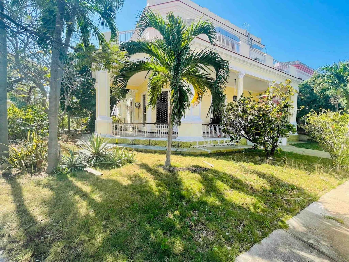 Hermosa casa de estilo colonial, en el corazón del Vedado, muy cerca del Hotel Habana Libre, y de muchos sitios de interés. Esta distribuida en 3 plantas, con bellos salones y terrazas exteriores; la tercera planta es una azotea solarium preciosa para relajarse con vistas al mar y a la ciudad. La casa consta de 8 habitaciones, todas con baño privado excepto una que tiene el baño afuera (privado). El desayuno para nuestros clientes esta incluido. Se alquila por habitaciones, o entera.