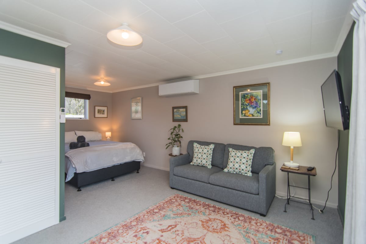 El estudio independiente es ideal para parejas, viajeros solitarios o personas de negocios. Ubicado no muy lejos del centro de la ciudad, pero tiene un ambiente rural, que te da paz y tranquilidad. Cama de matrimonio, nevera, tostadora, cafetera/tetera, desayuno continental y wifi (ahora con conexión vía satélite) Un lugar agradable, cómodo y acogedor para alojarse. Geraldine es una ciudad vibrante que ofrece tiendas boutique, cafés y numerosas actividades al aire libre. El acceso es a través de una caja de seguridad, lo que te da un control total.