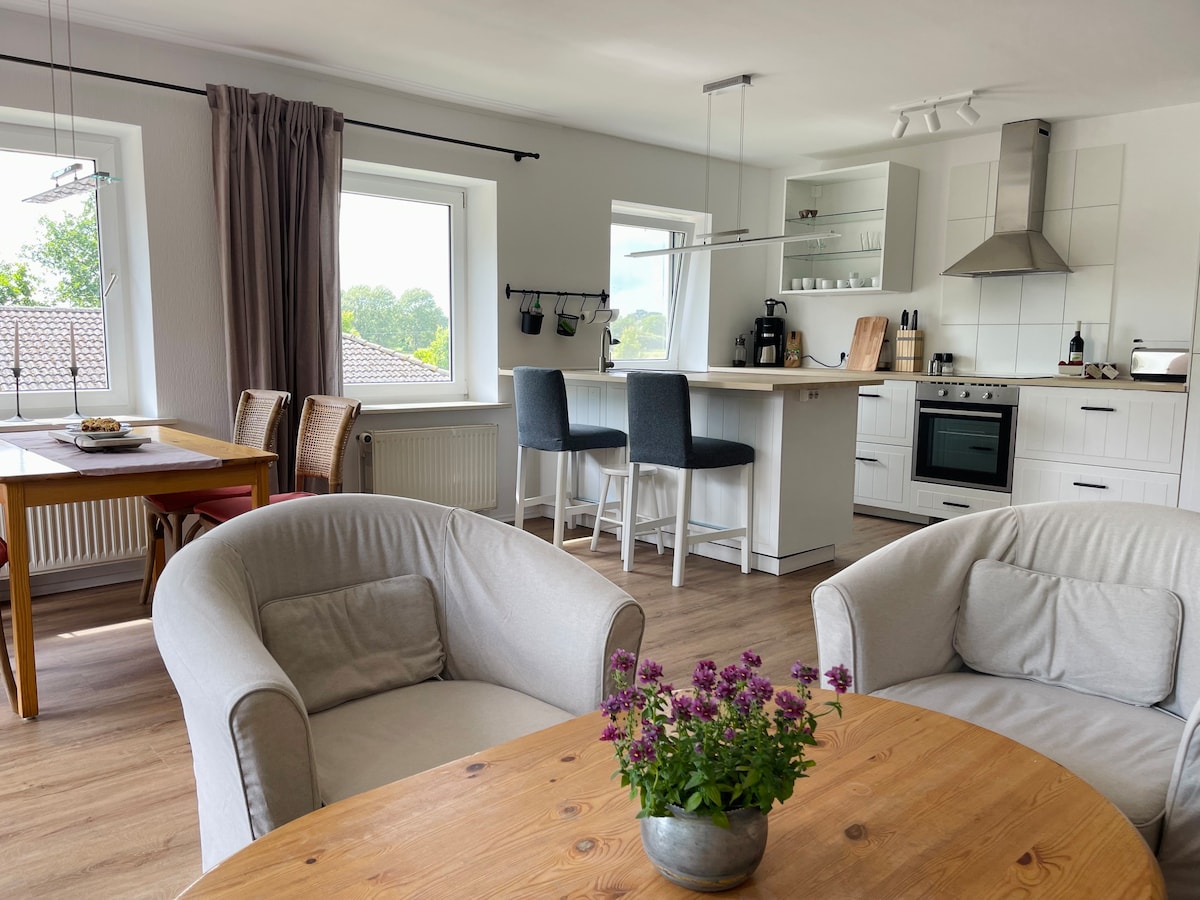 Bienvenido a Feldhusen, un pueblo idílico y muy tranquilo, a 2 km de la costa del mar Báltico. El apartamento recién renovado en el primer piso consta de una sala-comedor con cocina americana (incl. Lavavajillas y lavadora), baño con ducha y bañera y un dormitorio en el ático con cama doble grande (1,8 m). El apartamento cuenta con una gran terraza privada en la azotea. La sala de estar-comedor ofrece un sofá cama adicional, así como una estación de trabajo.