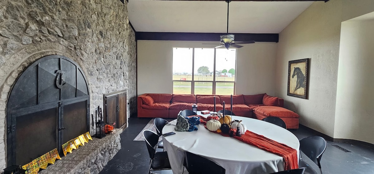 Country living at its best! Come see the night stars unobstructed from tall buildings. Hear the coyotes howl and the crickets chirp. There are two living spaces with several sofas for plenty of room. Fiber internet and tv. The heat and air unit has been replaced. There are 2 complete bathrooms with 2 showers, 2 toilets, 2 sinks. We have pens that could house your horse or show calf or lambs. Please get with us ahead of time so we can make arrangements.