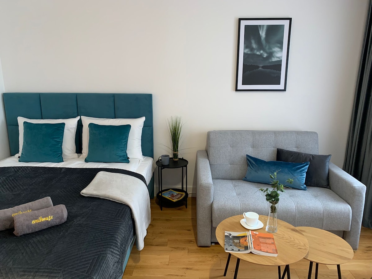 Los apartamentos Emihouse son apartamentos perfectamente ubicados, modernos y cómodos, totalmente equipados y diseñados con gusto y atención a la funcionalidad. Un apartamento de lujo es un apartamento de 49 m2 con balcón y: • Una sala de estar con una zona de cocina totalmente equipada y un sofá cama doble. • Un dormitorio con una cama matrimonial grande y cómoda • Baño con ducha, lavadora y secador de pelo. • dos armarios espaciosos: en el pasillo y el dormitorio.
