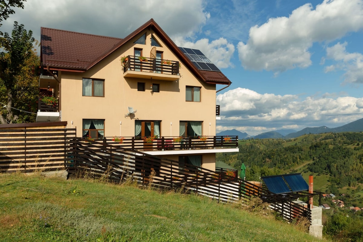 Da la bienvenida a nuestra hermosa casa de madera. Ubicada en una zona muy tranquila con una vista espectacular sobre las montañas Piatra Craiului y Bucegi, la casa tiene fácil acceso a maravillosas áreas para caminar con vistas excepcionales, ciclismo de montaña, ruta de escalada, pista de esquí Bran y "Castillo de Drácula" (a 3,4 km de distancia).