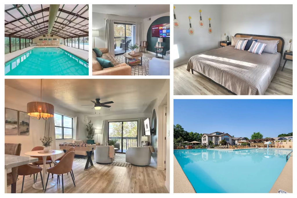 Enjoy a stylish and relaxing getaway in Branson’s premier condo resort. Nestled inside the gated Pointe Royale Golf Village, our luxury condo is your perfect blend of comfort and excitement—just minutes from Branson’s famous entertainment district. Luxury Living – Thoughtfully designed with all West Elm furnishings, no expense spared. Stay & Play Golf Special – only $60 per person! Resort Amenities – PGA-rated golf course, outdoor seasonal pool, hot tub, and indoor pool.
