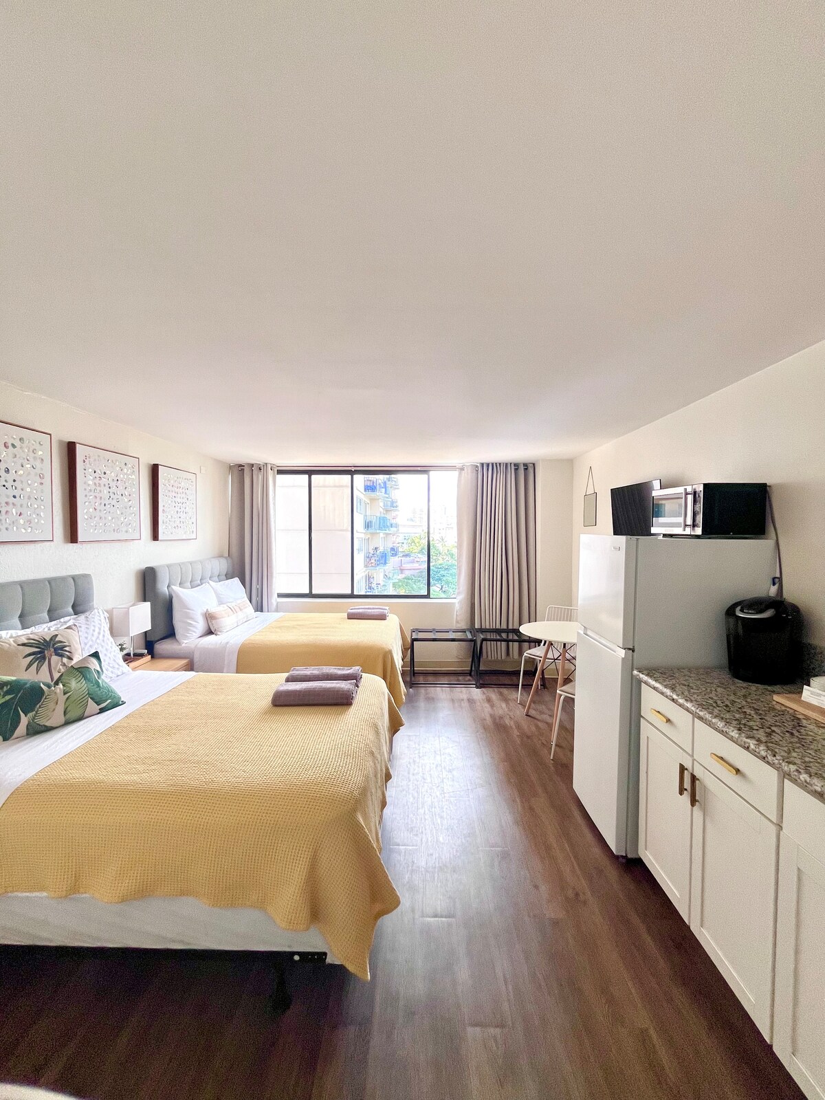 Aloha! Welcome to your perfect getaway,fully equipped accommodation with kitchenette.Everything you need to enjoy your time on the island. Exceptional Amenities, NO resort fees! Elevated views, picturesque cityscape backdrop+ Beach Gear. The ideal condotel offering for extended stays, travelling professionals or a quick vacation.A blended space of traditional Hawaiiana and contemporary furnishings and hand-curated local artwork.Comfortably accommodates 3-4 people.Your home, away from home.