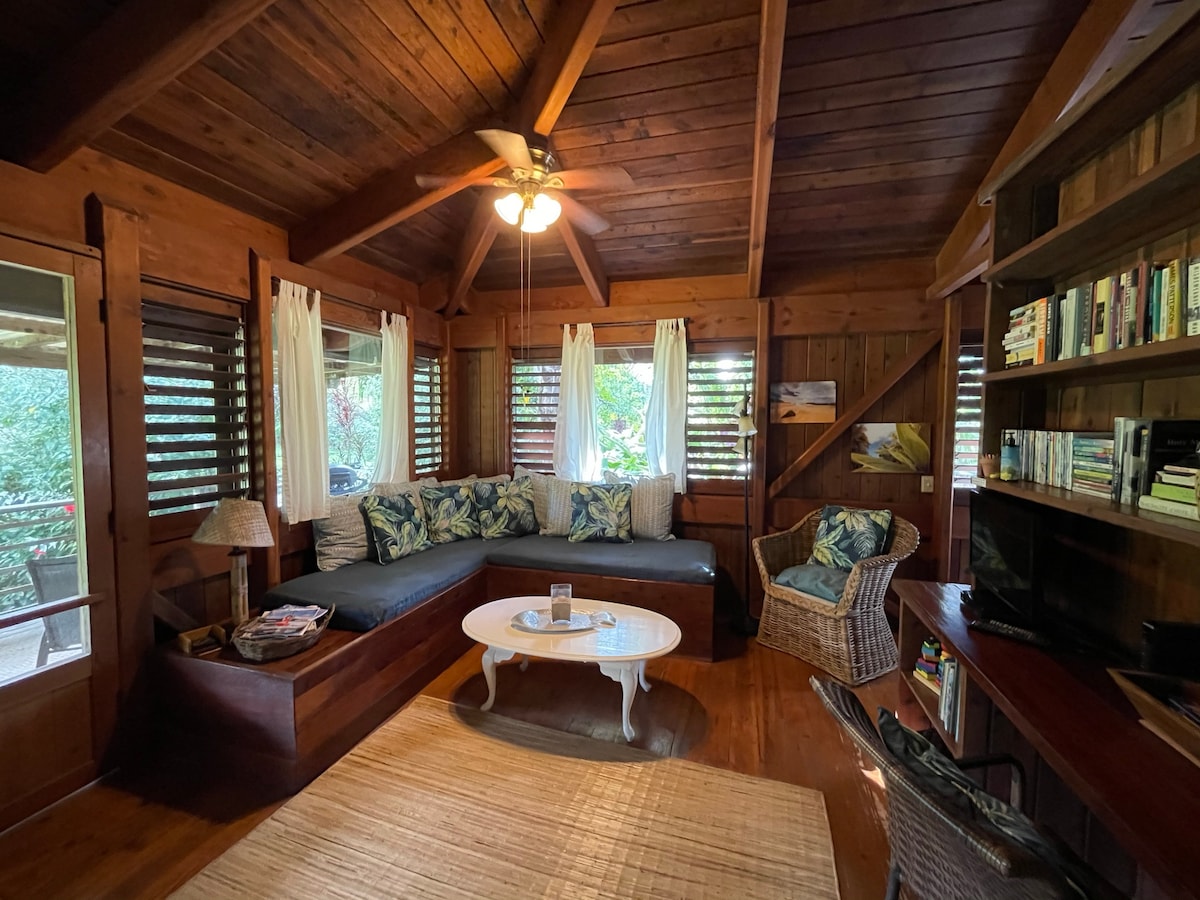 La casa de campo es una atractiva casa de huéspedes de madera de 500 pies cuadrados hecha a mano, completamente independiente y lejos de la casa principal. Tiene vistas a nuestro huerto. Está ajardinada con exuberantes plantaciones tropicales para asegurar tu privacidad y decorada en un estilo isleño sencillo y de buen gusto. GE-085-597-1840-01 TA-085-597-1840-01