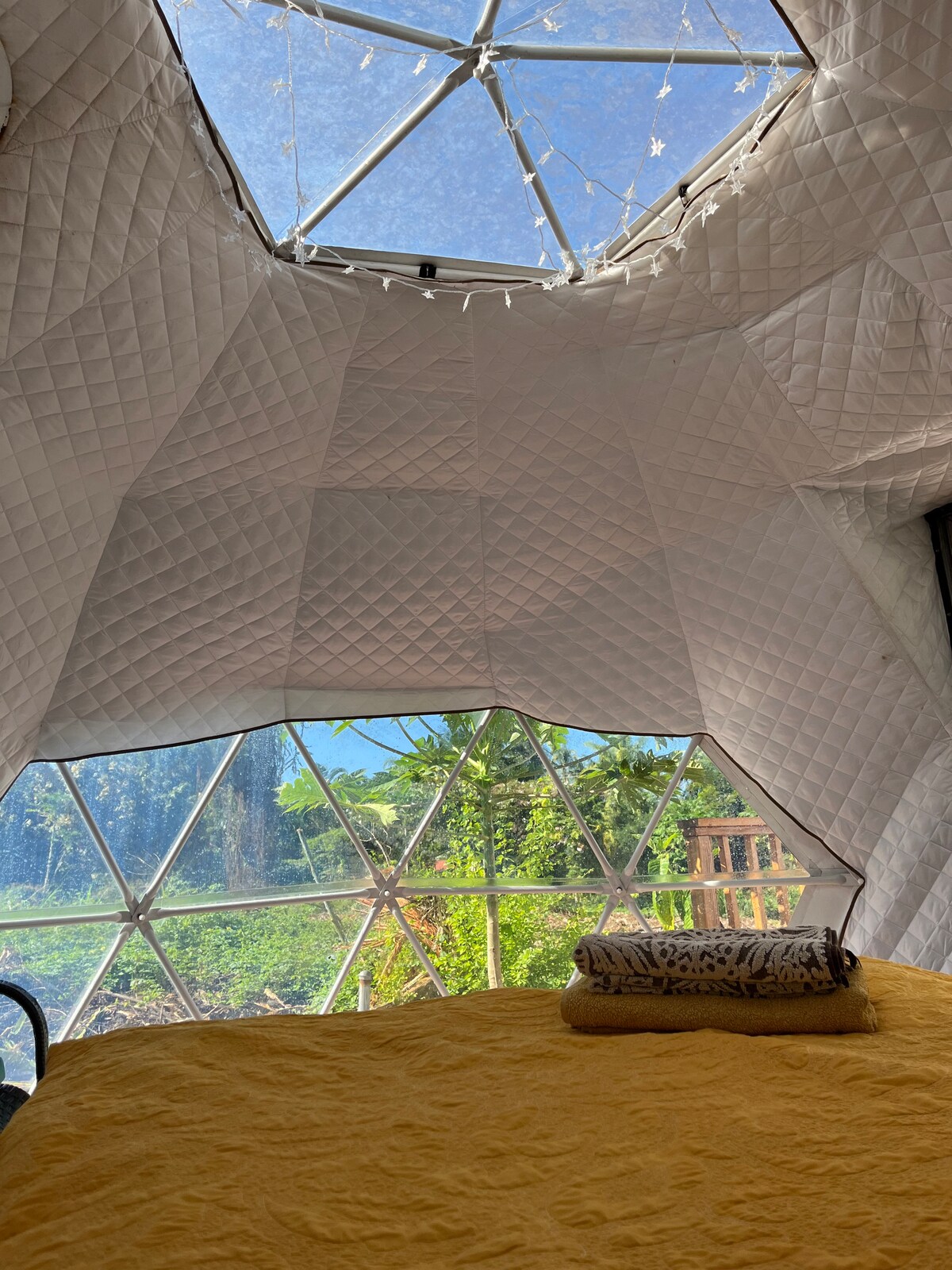Escápate al paraíso en nuestra exclusiva experiencia de cúpula geodésica glamping ubicada en una exuberante propiedad de 3 acres. Te encontrarás rodeado de los vibrantes colores y fragancias de las frutas tropicales, como café, piñas, plátanos y una variedad de otras frutas tropicales. Disfruta de vistas panorámicas al mar que se extienden hacia fascinantes puestas de sol, creando un ambiente de pura tranquilidad. Nuestra cúpula ofrece una mezcla única de vida fuera de la red y comodidad moderna, alimentada por fuentes de energía sostenibles.