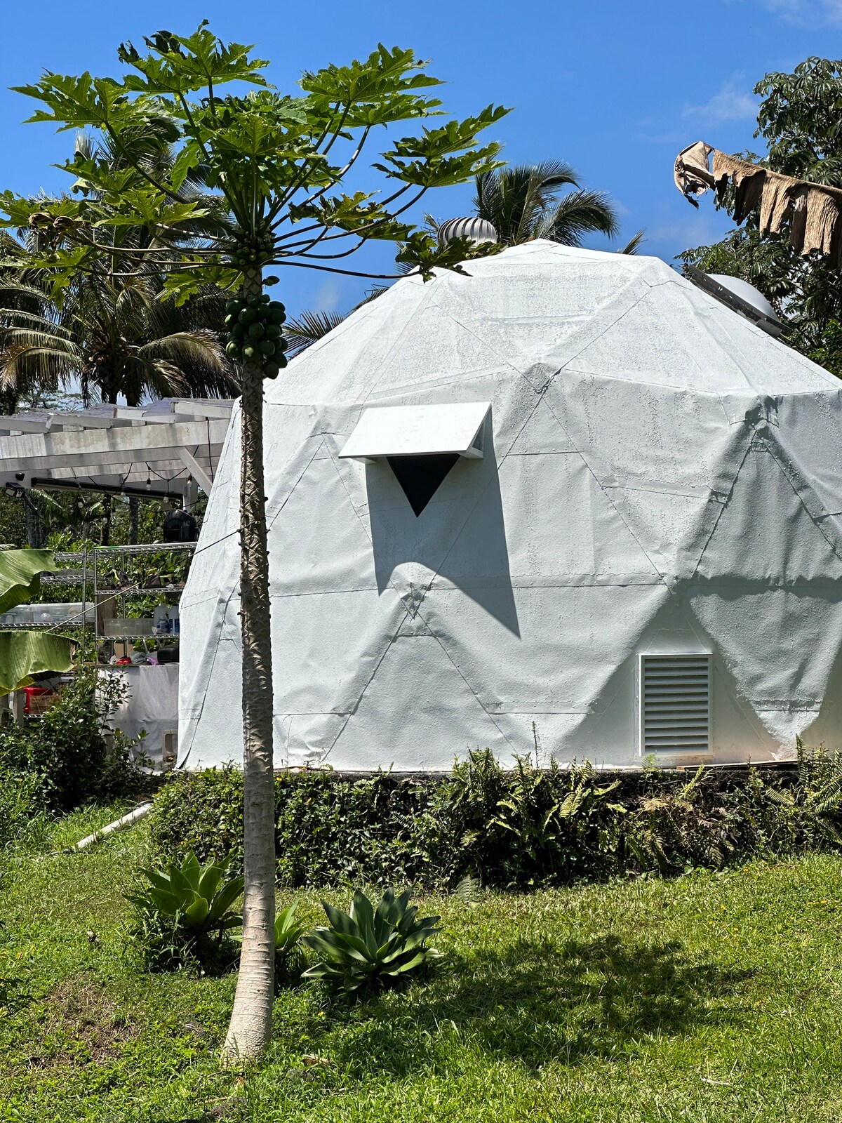 Experience modern day homesteading on a small scale, one acre, organic farm in a unique geodesic dome with high speed wifi, on-grid electricity, fridge/freezer, unlimited drinking, compost toliet, outdoor shower, yoga mats, access to the lanai with an upgraded bathroom, outdoor kitchen, picnic area. Extra cabin and camping area is blocked off from other guests, additional fee to use cabin/camping area areas for larger parties. Towels not included. Ask about our farm to table meal options!