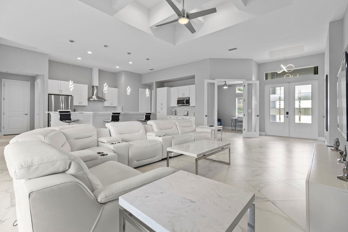 La sala de estar tiene un televisor inteligente de 65 pulgadas, montado en la pared con una chimenea LCD debajo con sonido envolvente. Todos los televisores tienen Netflix. La sala de bar tiene una nevera pequeña, mesa de billar y tablero de dardos. El exterior tiene un lanai privado con piscina climatizada y un fogón de propano. Disfruta del sonido de sonos con un televisor inteligente de 55 pulgadas en el dormitorio principal. El segundo dormitorio también tiene un televisor. La sala de bar también tiene sonido, así como el lanai. A 30 minutos de varias playas. El garaje no estará disponible. Casa ubicada en un tranquilo Cul de Sac.