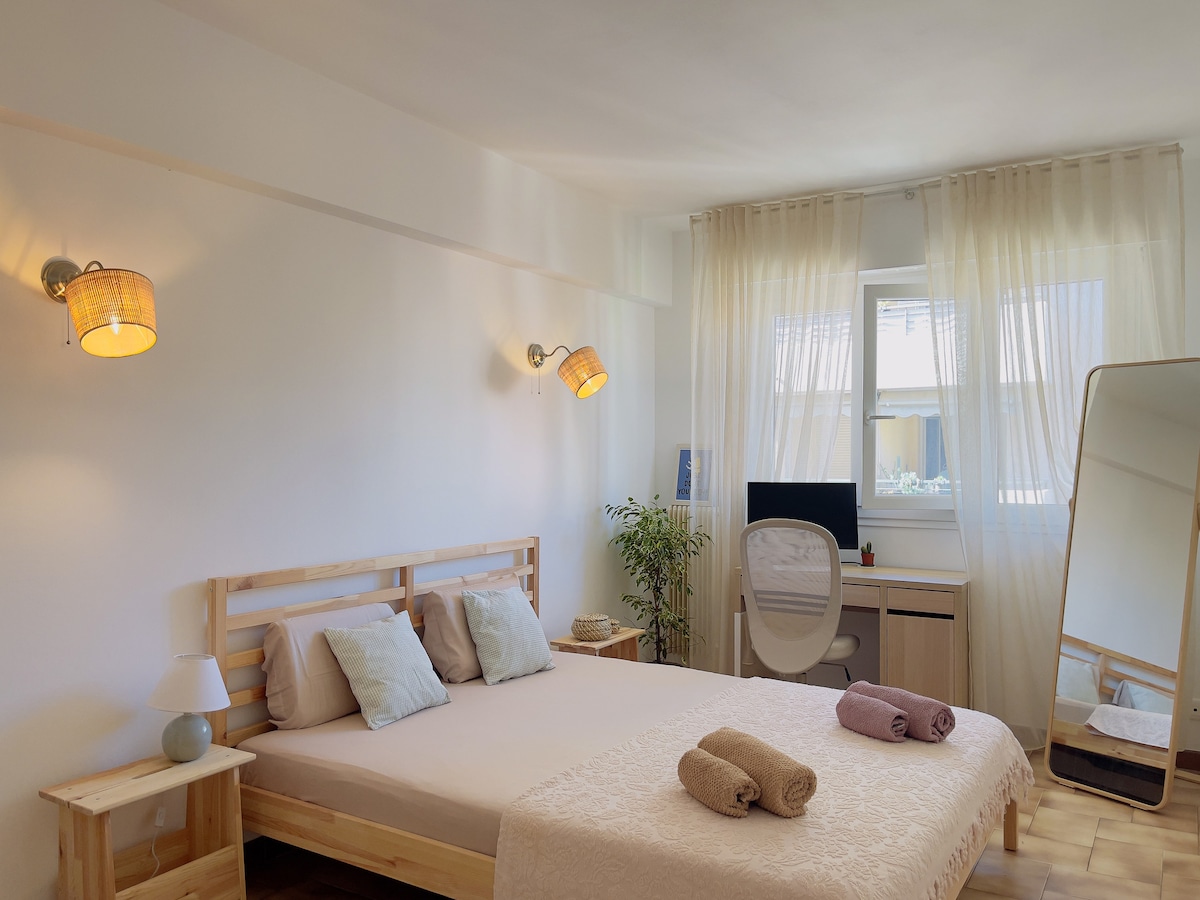 Au Port, proche centre et plage, emplacement privilégié, appartement traversant, lumineux offrant vue mer et colline. Calme absolu. Salon (grand canapé) et cuisine américaine bien équipée pour 4 personnes. Chambre (lit queen size) avec salle de douche attenante bénéficiant comme la chambre d’une grande fenêtre. A proximité immédiate: commerces, restaurants, tramway, bus, train. Pas de parking privé mais plusieurs places publiques gratuites possibles à proximité immédiate. Parking payant proche.