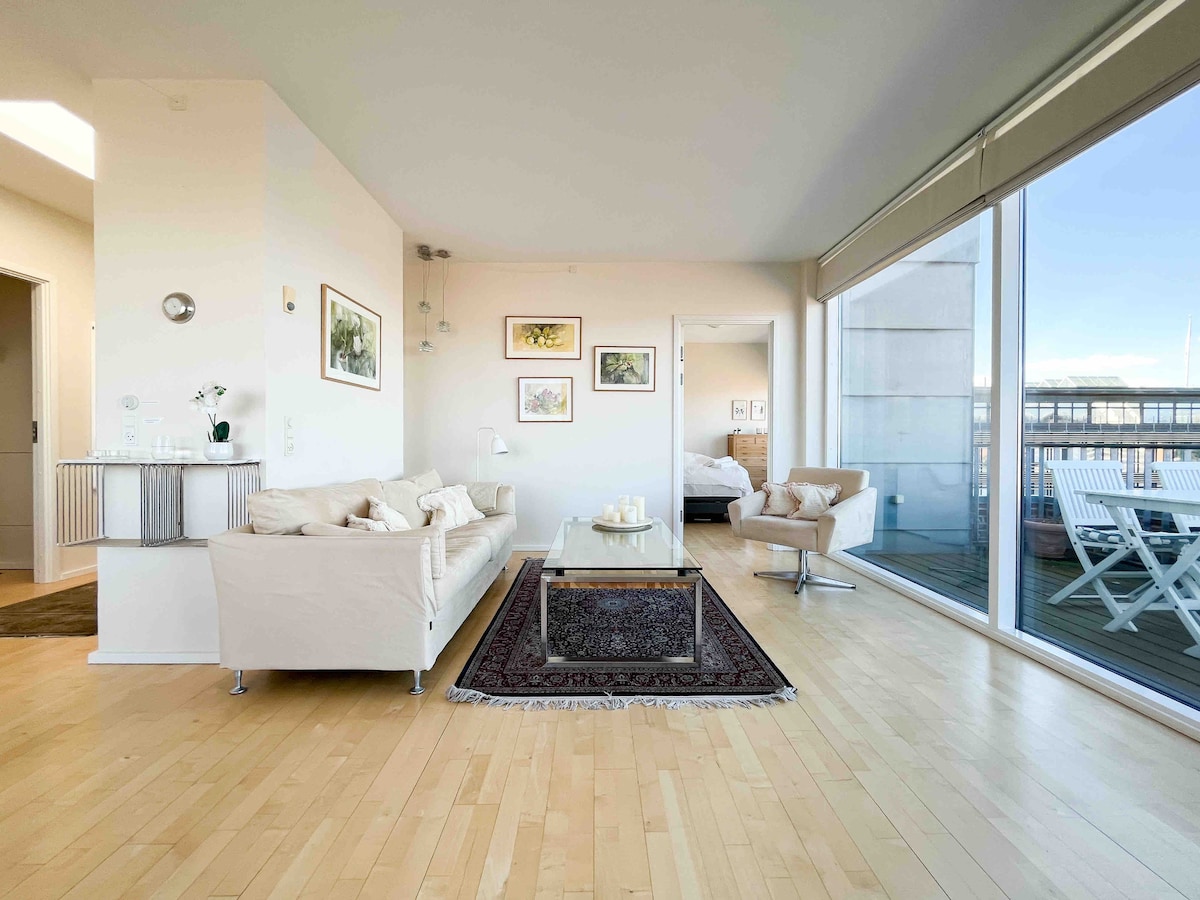 Amplio y soleado apartamento moderno en el décimo piso del preciosamente renovado Wennberg Silo, un antiguo silo de almacenamiento convertido en 2004 en una propiedad residencial por el galardonado arquitecto Tage Lyneborg. Aparcamiento gratuito en el edificio. Terraza compartida de 230 metros cuadrados. Barco-autobús a Nyhavn y al centro de la ciudad en la puerta. Una gran sala de estar con rincón de cocina, terraza orientada al S-W y al canal. Dormitorio con cama tamaño queen. Sofá cama extracómodo de 140 x 200 en la sala de estar. ¡Puedes nadar en el canal!