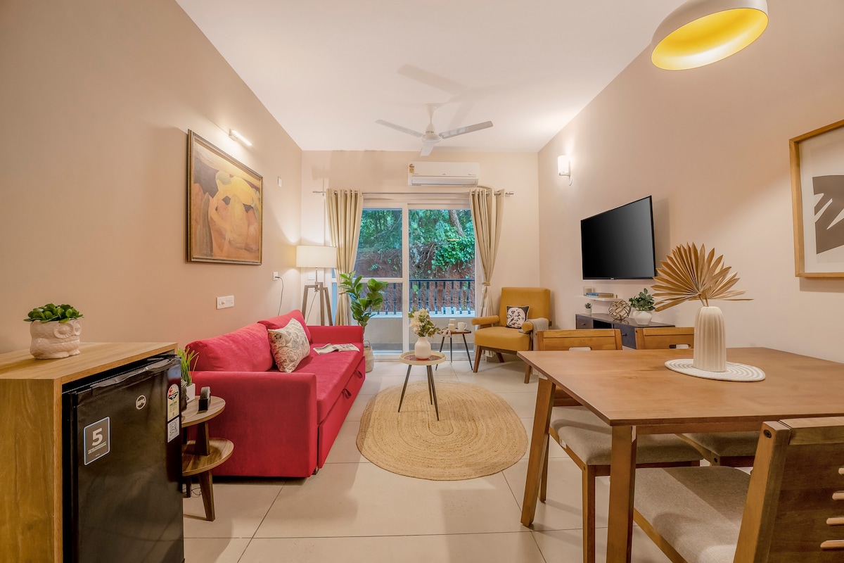 ¡Bienvenido a Casa Siesta de Pink Papaya Stays en Calangute! Casa Siesta, un encantador 1BHK, es perfecto para parejas, familias pequeñas o amigos. Cuenta con una acogedora sala de estar, cocina abierta y dos balcones para tomar café por la mañana o disfrutar de la brisa nocturna. Está cuidadosamente diseñado y totalmente equipado para una estancia cómoda. Situado en un complejo sereno a solo 2,3 km de la playa de Calangute, ofrece una piscina reluciente, aparcamiento privado y seguridad las 24 horas, los 7 días de la semana, para tu escapada ideal a Goa.