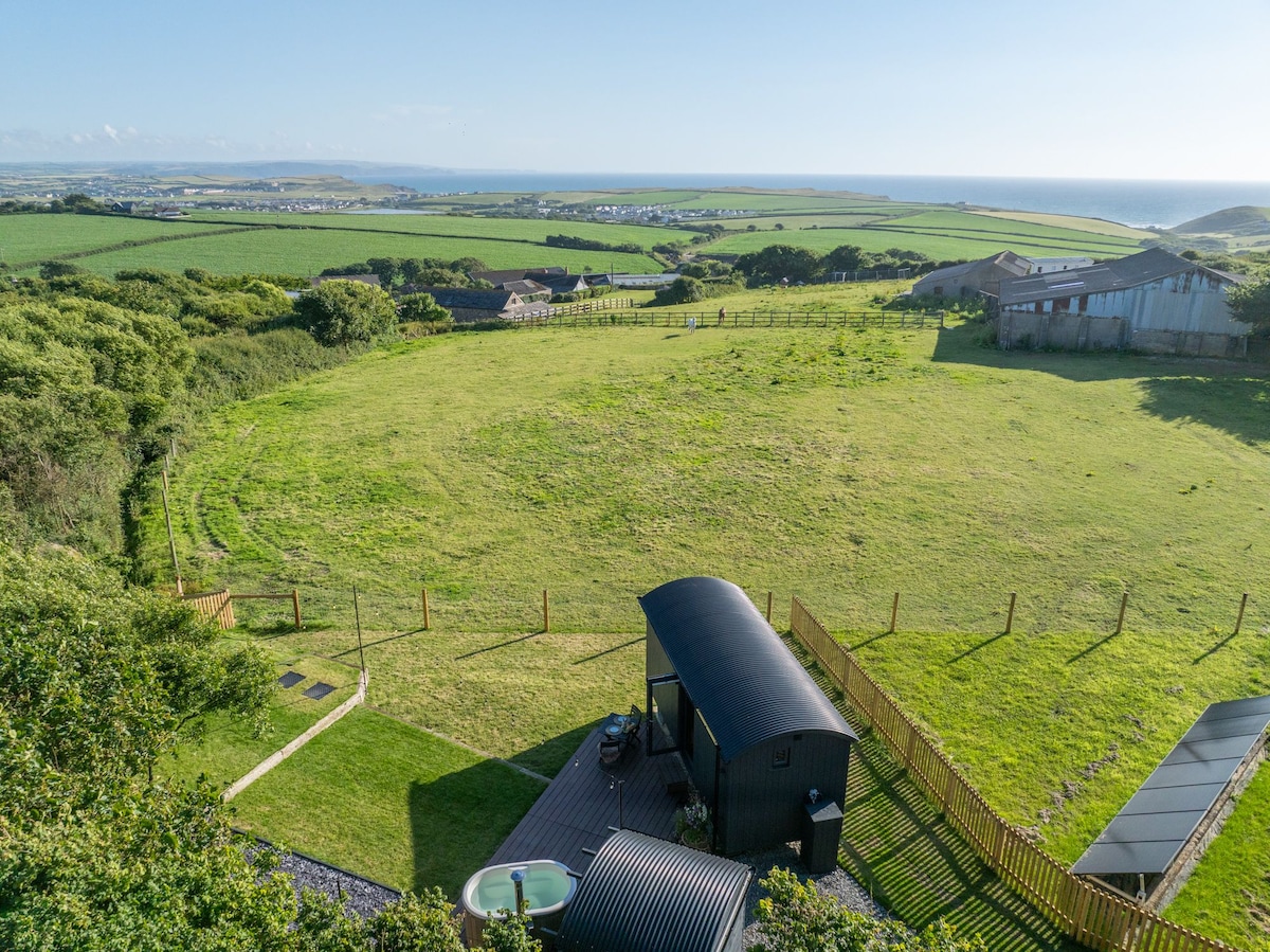 Calentada en todas partes, ¡esta es una cabaña tostada en cualquier época del año! Encontrarás un acogedor sofá frente a la estufa de leña, wifi, TV y reproductor de DVD, radiadores, una cama tamaño king, cocina bien equipada y cuarto de ducha y un jacuzzi burbujeante caliente y listo para tu llegada. A solo unos minutos de la ciudad de Bude y sus playas, pubs y restaurantes, el sendero de la costa suroeste, esta cabaña rural con vistas al mar desde el jardín, permanece aislada en un rincón tranquilo del prado, con todos los servicios y senderos cerca.