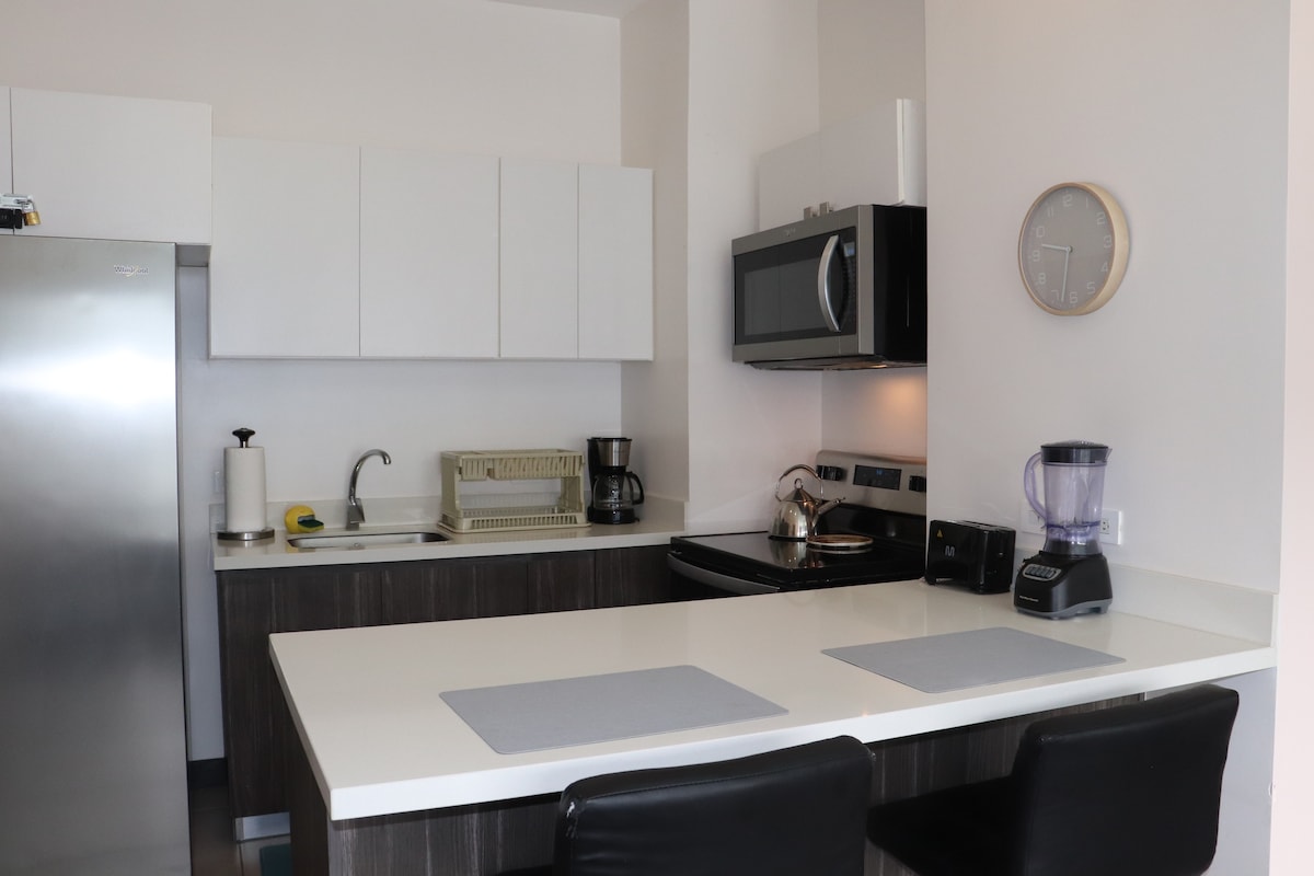 Relájate en un lugar tranquilo, acogedor, con todas las comodidades para que disfrutes de tu estancia. Apartamento para no fumadores o dentro del recinto. *No tiene aire acondicionado* Torres de Heredia condominium. El apartmento de 1 cuarto con cama king, fibra óptica Wi-Fi, tv cable, cocina equipada, Refrigerador, Microhondas, Coffee maker, comedor y sala. La seguridad es 24/7. Área Social con piscina y BBQ, terraza y sofás, y coworking. *No tiene aire acondicionado*