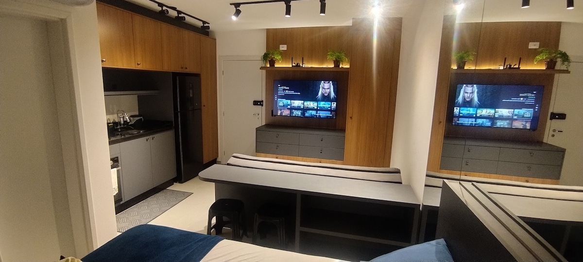 Estudio moderno, nuevo, acogedor, ubicación perfecta, con una hermosa vista desde el balcón, especialmente por la noche. Wifi rápido, escritorio, TV inteligente de 55”, cama Queen. Aire acondicionado (frío/calor). Lavadora y secadora y una hermosa isla en la cocina. 50m2 de mucho estilo-27ºandar, Silencioso. En el Centro/Batel, cerca de comercios, bancos, centros comerciales, polo gastronómico y Hospital. En el edificio: piscina, gimnasio, sala de juegos, sauna, jacuzzi, conserjería las 24 horas.