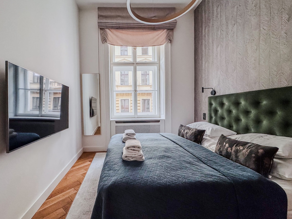 ¡Encuentra tu paraíso urbano ideal en Mucha Apartment, escondido en el centro de Praga! Este gran apartamento te envuelve en comodidad y encanto como un abrazo iluminado por el sol. Puede alojar fácilmente hasta 8 personas con 3 dormitorios. ¡Cocina totalmente equipada para hacer un festín para tu familia o amigos! Aquí también puedes disfrutar de una sauna de bienestar en casa. Es la mezcla perfecta de las canciones de cuna históricas de la ciudad y la serenidad pacífica, prometiendo una estancia que se siente únicamente tuya, llena de calidez y relajación.