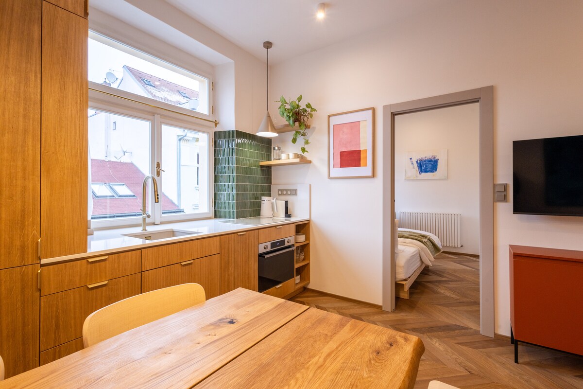 Gentleman Spirit Residence Prague Experimenta la elegancia atemporal en Gentleman Spirit Residence Prague, donde la sofisticación se encuentra con una comodidad inigualable. Ubicada en el corazón del famoso distrito de Zizkov, esta lujosa residencia irradia un aura espiritual, con sus ricas texturas, muebles personalizados y un toque carismático de vitalidad y energía oscura. Disfruta de la cocina totalmente equipada, relájate en la elegante sala de estar y descansa con la máxima comodidad, rodeado de un ambiente que inspira y recarga