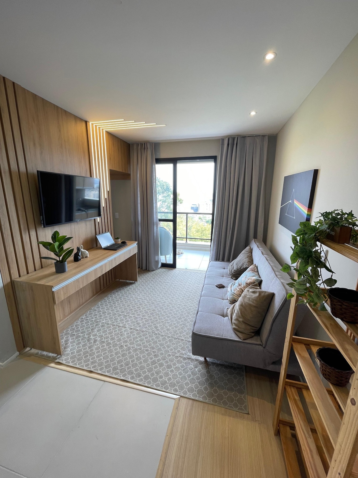 El loft, decorado con estilo, tiene un concepto abierto con un divisor de madera que separa el dormitorio de la sala y la cocina. Tiene 2 televisores, uno en el dormitorio y otro en la sala. Con una cómoda cama doble, ventanas que dejan entrar luz natural, una cocina integrada con la sala de estar y un amplio balcón en forma de L con una vista surrealista de la Playa de Icaraí. Totalmente equipado, está a 200m de la playa, cerca de farmacias, mercado, restaurantes y la calle famosa de Icaraí.