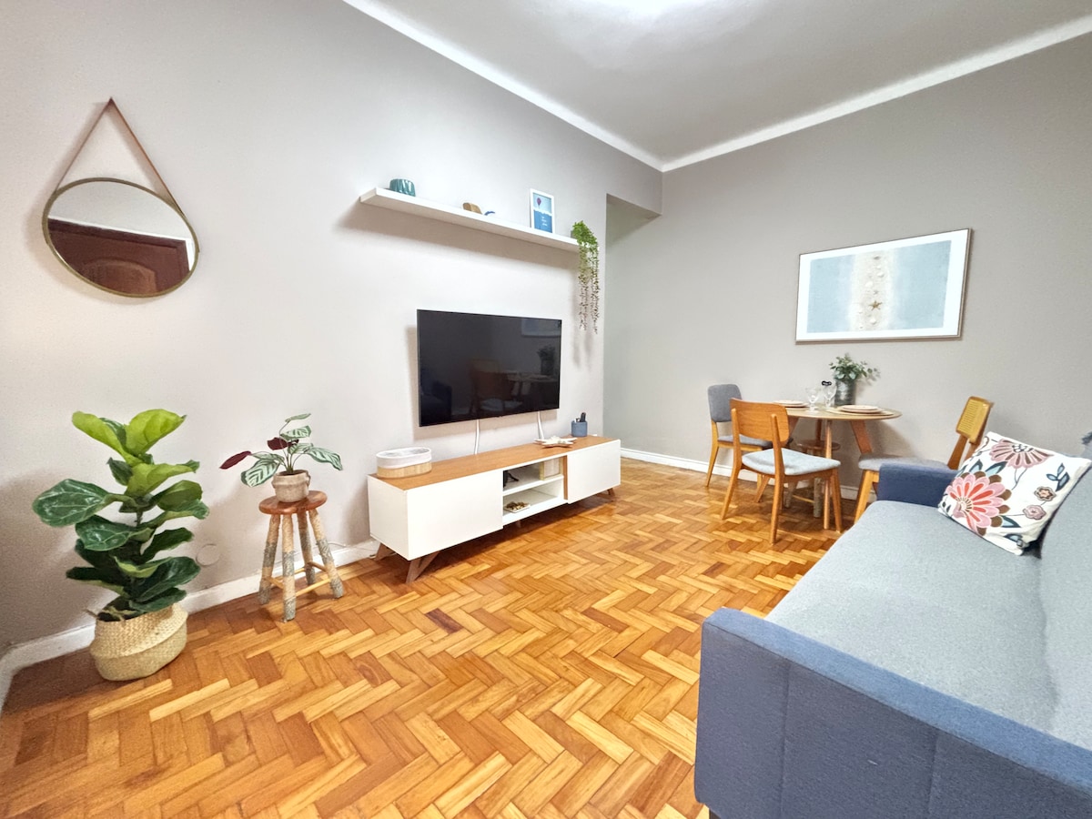 ¡Apartamento de estilo bohemio y chic, en la playa de Copacabana! - Cama queen, sofá cama, mesa de comedor, aire acondicionado y espacio para oficina en casa (Wifi 300Mbps). Cocina con estufa, nevera, horno, microondas, licuadora, cafetera, exprimidor, sandwichera, sartenes, utensilios de cocina, varios libros, guitarra y TV con aplicaciones. - Mercado y farmacia debajo del edificio, restaurantes y tiendas alrededor del apartamento. - Aeropuerto a 8,3 km. - Cristo Redentor a 11,5 km. - Pão de Açúcar a 2,8 km