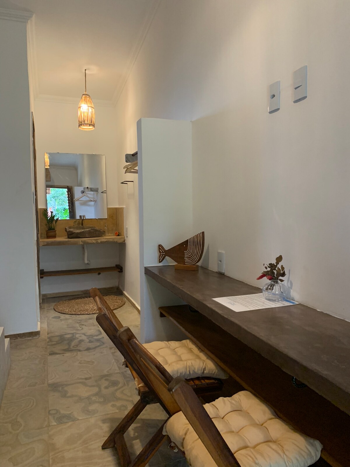 A suíte dispõe de uma cama de casal, rede, ar condicionado split, ventilador de teto, tv, frigobar e banheiro privativo com box blindex e ducha com água quente. Para casais com criança, há possibilidade de acrescentar uma cama de solteiro. Suíte Dupla (andar superior) - uma cama de casal, ar condicionado split, ventilador, frigobar, tv, armador de rede nas partes interna e externa, mesa de apoio, banheiro privativo com box blindex e ducha de água quente e internet wifi, para a hospedagem de até.