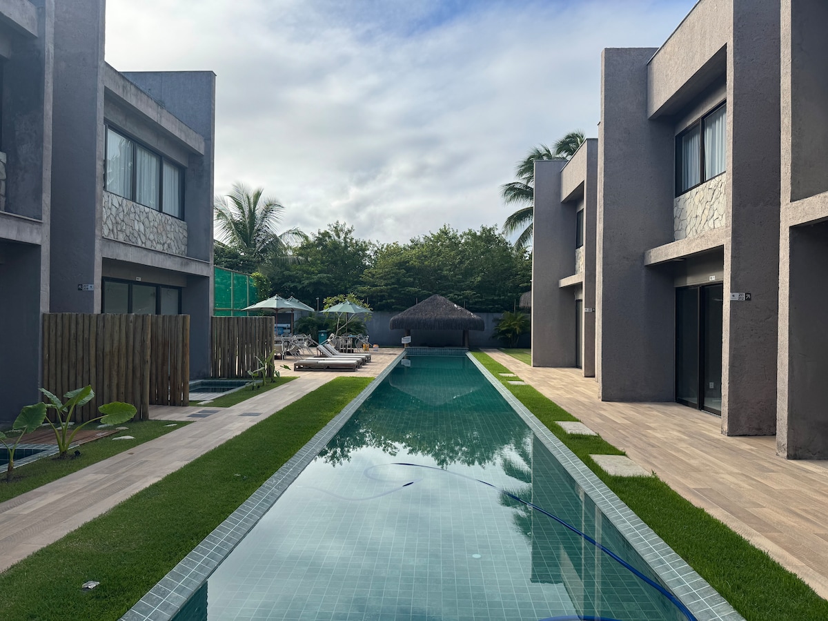 Loft en Condominio Cerrado de Lujo con 2 suites, con capacidad para 6 personas, 1 cama doble Queen, 2 camas individuales (reversibles a cama doble) y 1 sofá cama (para 2 personas). Cuenta con sala de estar con balcón gourmet, cocina totalmente equipada con horno eléctrico, cocina de 4 fuegos, microondas, nevera y utensilios de cocina. Cuenta con espacios para la convivencia como piscina con deck, hidromasaje y bicicletero. A solo 500 metros de la playa de Riacho, junto a la famosa Iglesia de Milagres