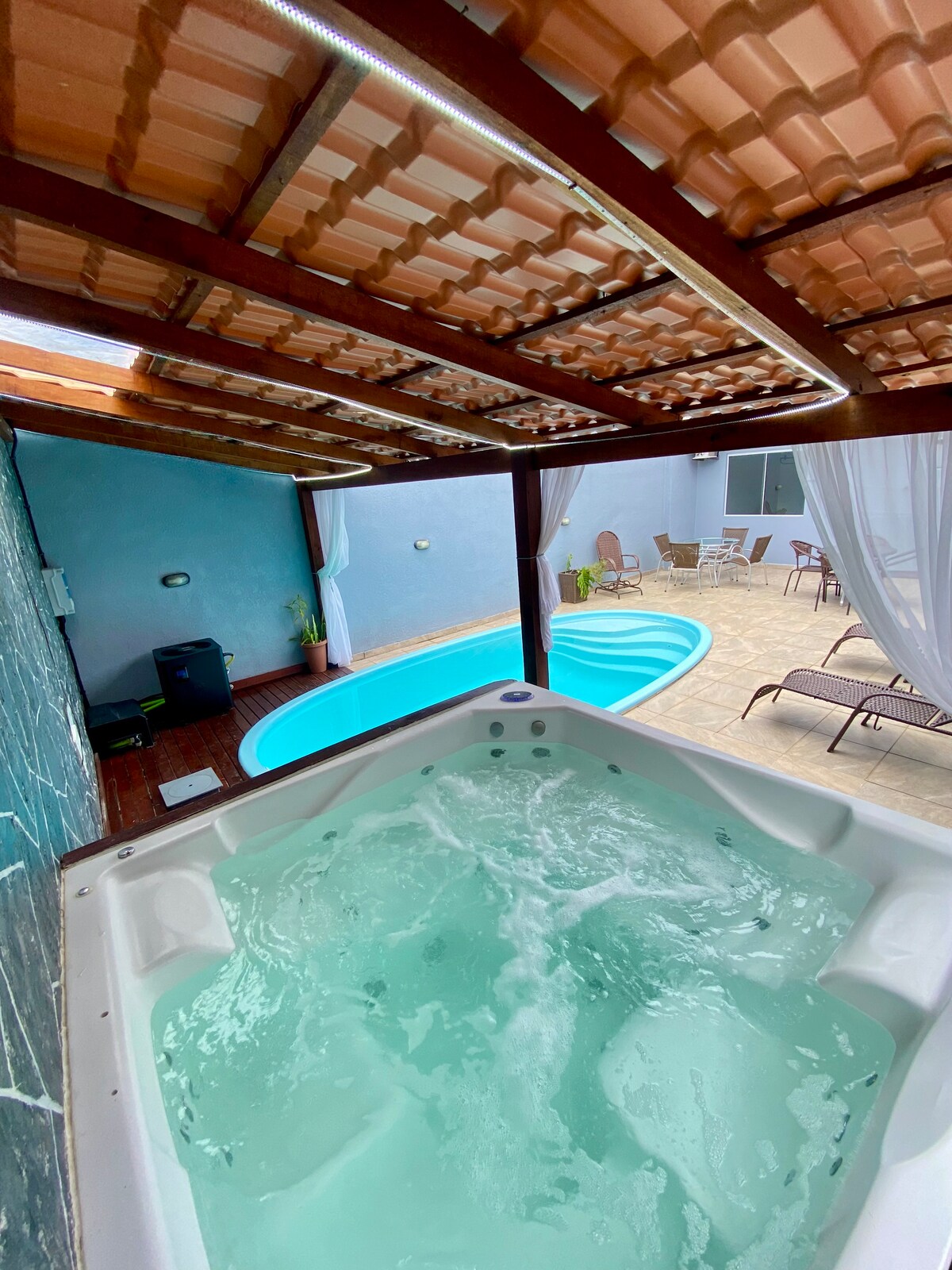 Desfrute momentos incríveis em Famílias e amigos! 🏊 Piscina aquecida até 36°C — aproveite até no inverno 🍖 Área gourmet com 2 churrasqueiras 🎱 Espaço de lazer com sinuca e diversão garantida 🛏️ 3 quartos + mezanino (acomoda até 10 pessoas) ❄️ Ambientes com ar-condicionado e ventiladores Máquina lavar roupa 11 kg 🚗 Vaga para até 3 carros 📍 Apenas 1 km da praia Um espaço pensado para descanso, diversão e privacidade. Aqui você cria memórias com quem realmente importa