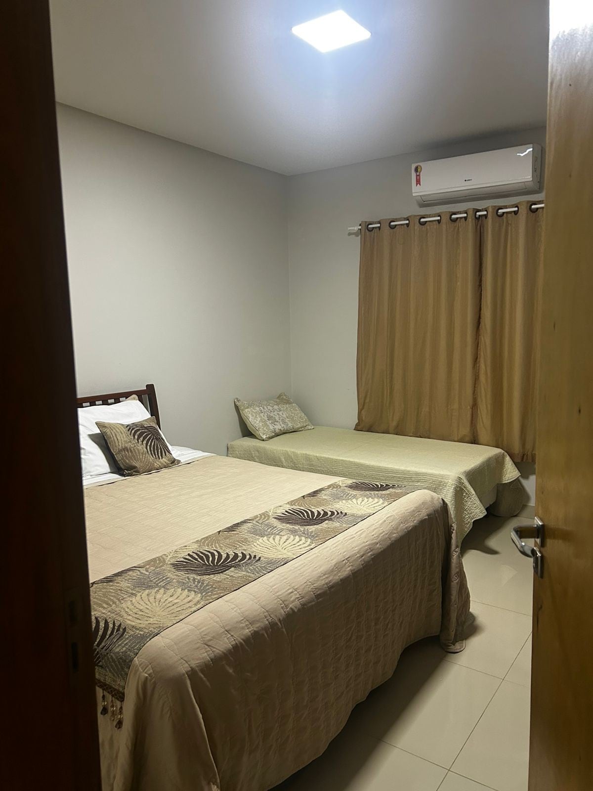 Gran superficie, bien ubicada con seguridad, servida cerca de restaurantes, panadería y a 350 metros del Lago Municipal. Tiene dos dormitorios, uno con una cama queen y una cama individual y el otro con una cama doble, dos baños, amplia sala de estar, cocina con barbacoa. Servicios: Ar Condicionado Juego de ropa de cama Toallas de baño equipo de higiene personal Lavadoras: vajilla - ropa Ferro de Passar Sanduicheira ° Microondas; Ollas Plratos Taças Tazas y frascos Cubiertos Licuadora
