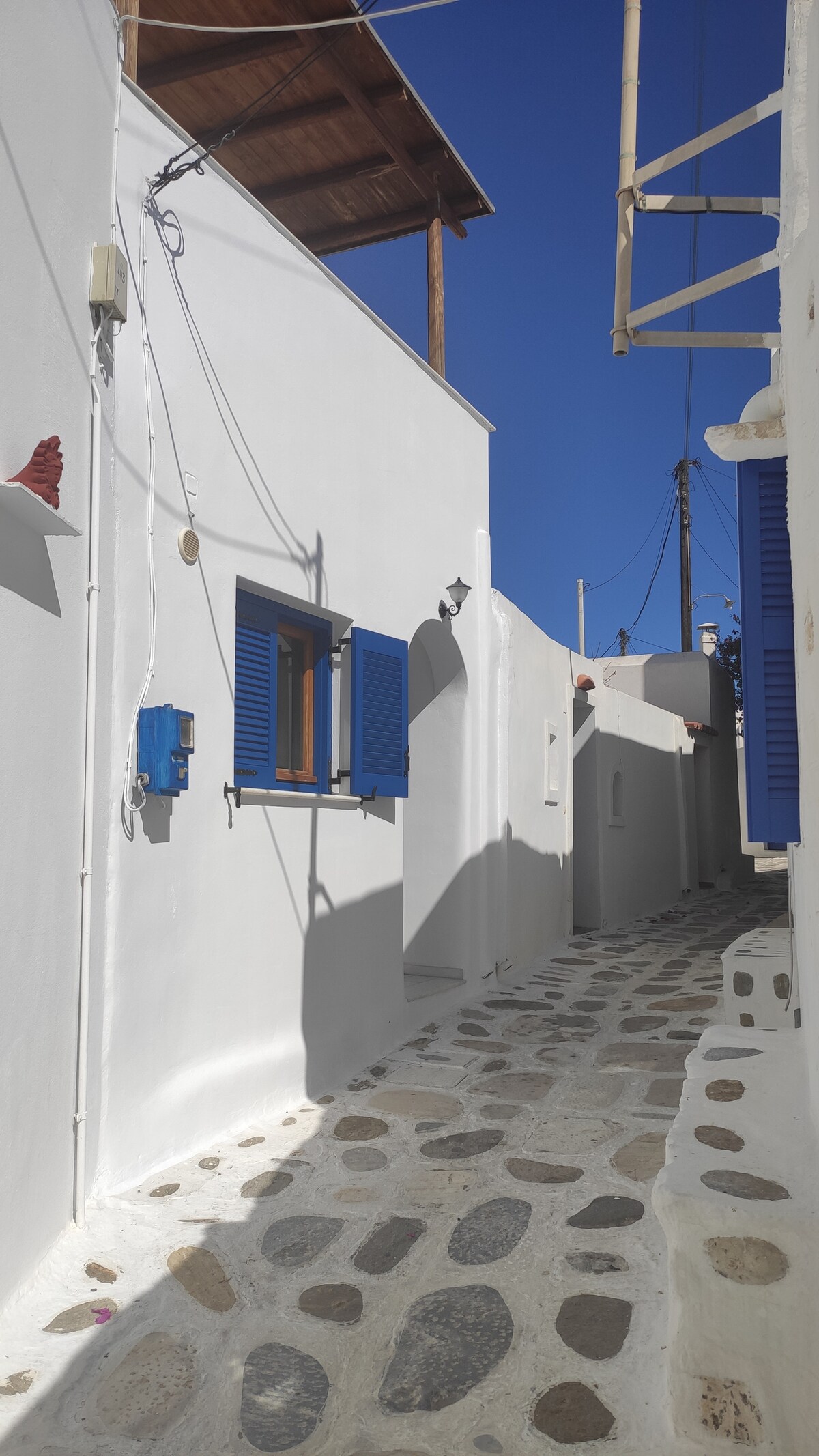 Nuestra tradicional casa de piedra cicládica (65 metros cuadrados) se encuentra en el centro del pueblo y tiene un maravilloso jardín con limoneros, naranjos, granados, albaricoques, aguacates y uvas, donde podrás relajarte y disfrutar de la naturaleza. El apartamento tiene una vista panorámica del pueblo y una impresionante vista al mar de la isla de Naxos. La casa es ecológica, apta para trabajar y tiene energía solar. El wifi también es fiable para trabajar. Aceptamos estancias largas. Todo lo que necesitas está a 20 metros a pie.