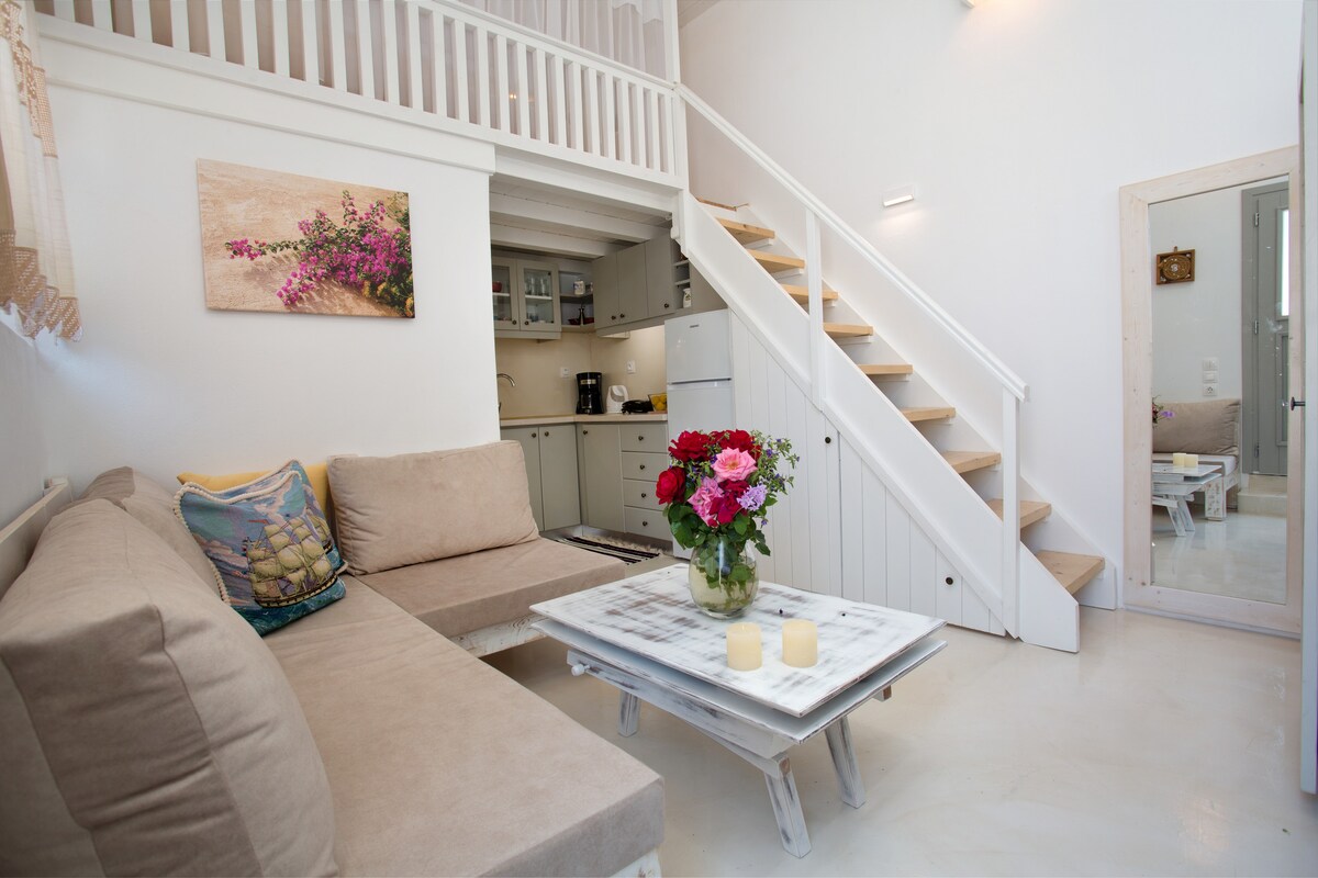 ¡Una casa cicládica clásica de nueva construcción, situada en el pequeño pueblo de Mármara a menos de 6 minutos en coche del mar! Disfruta de tus vacaciones en un barrio tranquilo, camina hasta la panadería local y experimenta la auténtica vida griega. La casa incluye un dormitorio doble, una cocina totalmente funcional, una sala de estar y un baño. ¡Hay acceso a Internet, TV y una nueva lavadora! Cerca de allí hay una farmacia,gimnasio y mercado a 4 minutos en coche. ¡Puedes visitar muchos lugares en Paros que te encantarán!