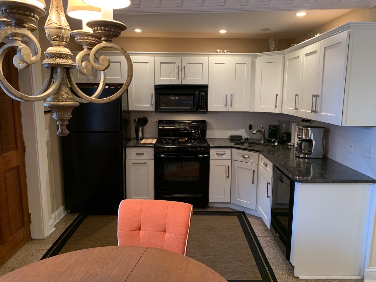 Esta es una casa de carruajes luminosa y espaciosa ubicada en el segundo piso en un barrio tranquilo y transitable. La sala de estar tiene una pantalla de cine desplegable, un sofá nuevo con diván y una cama tamaño queen extraíble. La cocina americana es nueva y cuenta con una cocina y horno Smeg, y un lavavajillas. El dormitorio tiene una cama ajustable tamaño queen, TV de 52 pulgadas con wifi y cable. El baño tiene una bañera de inmersión y una ducha a ras de suelo, un tocador con lavabos dobles. Hay un cuarto de lavado con lavadora y secadora. El propietario es agente inmobiliario.