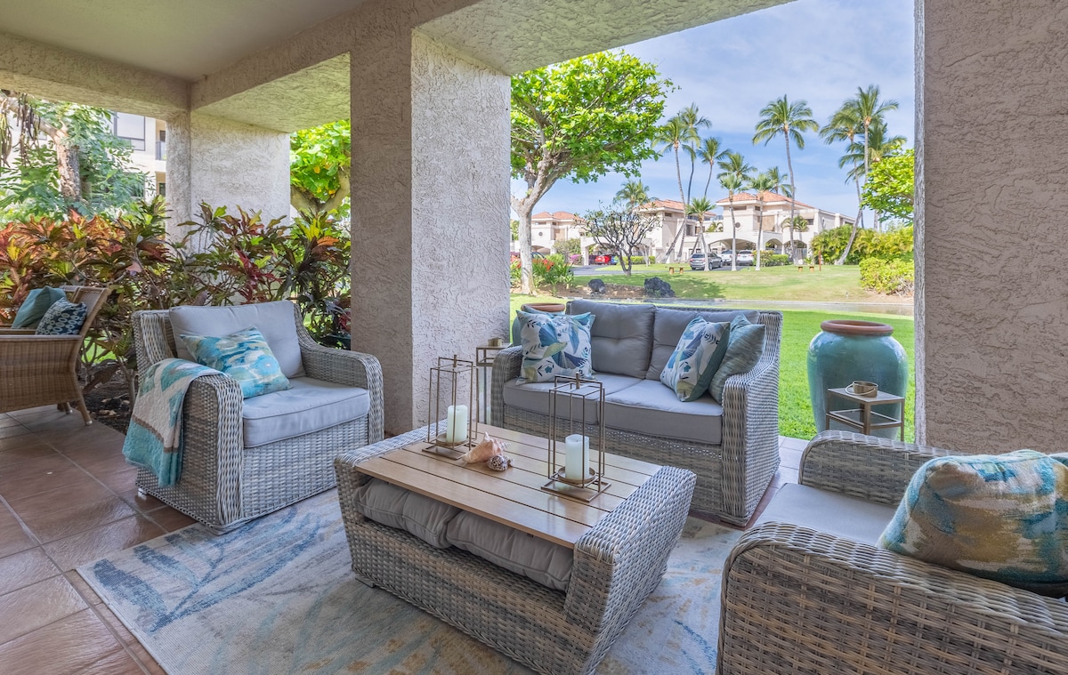 Disfruta de tu estancia en este tranquilo apartamento de 1 dormitorio y 1 baño en la planta baja, remodelado en 2023, en una de las mejores ubicaciones de Waikoloa Beach Resort. * Exuberante paisaje tropical con estanques y cascadas. * Junto a piscina, cancha de tenis, barbacoa y gimnasio. * A poca distancia a pie de la playa, tiendas, restaurantes, entretenimiento y Grand Hilton. * Wifi rápido y gratuito. Aire acondicionado central. Lavadora y secadora. * Televisores con cable Spectrum y transmisión Roku. * Plaza de aparcamiento privada a 50 yardas de la puerta principal.