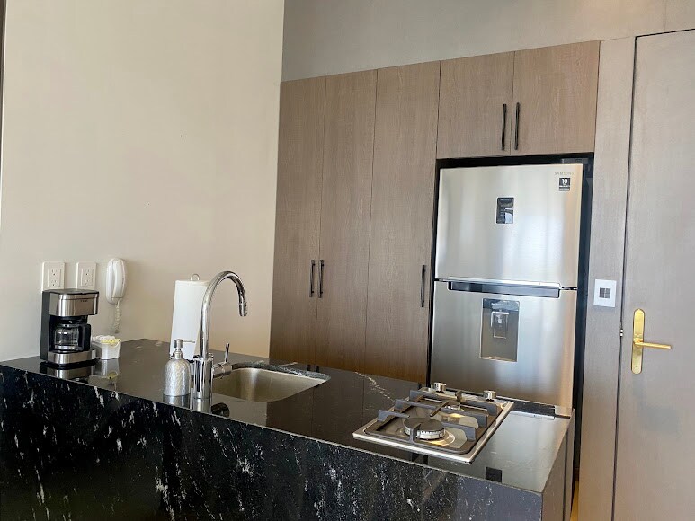 Hermoso Edificio con un gran diseño ubicado en el centro de la ciudad muy cerca de los principales atractivos, con seguridad las 24 hrs. de día. El departamento tipo loft ubicado en Planta Baja es un espacio acogedor, funcional, moderno, con todas las comodidades, cuenta con patio propio que permite relajarte a cualquier hora del día ya sea para tomar un café, leer o pasar el rato . Cuenta con una recámara abierta, amplio closet, cocina, comedor, sala, patio, lavasecadora, baño completo