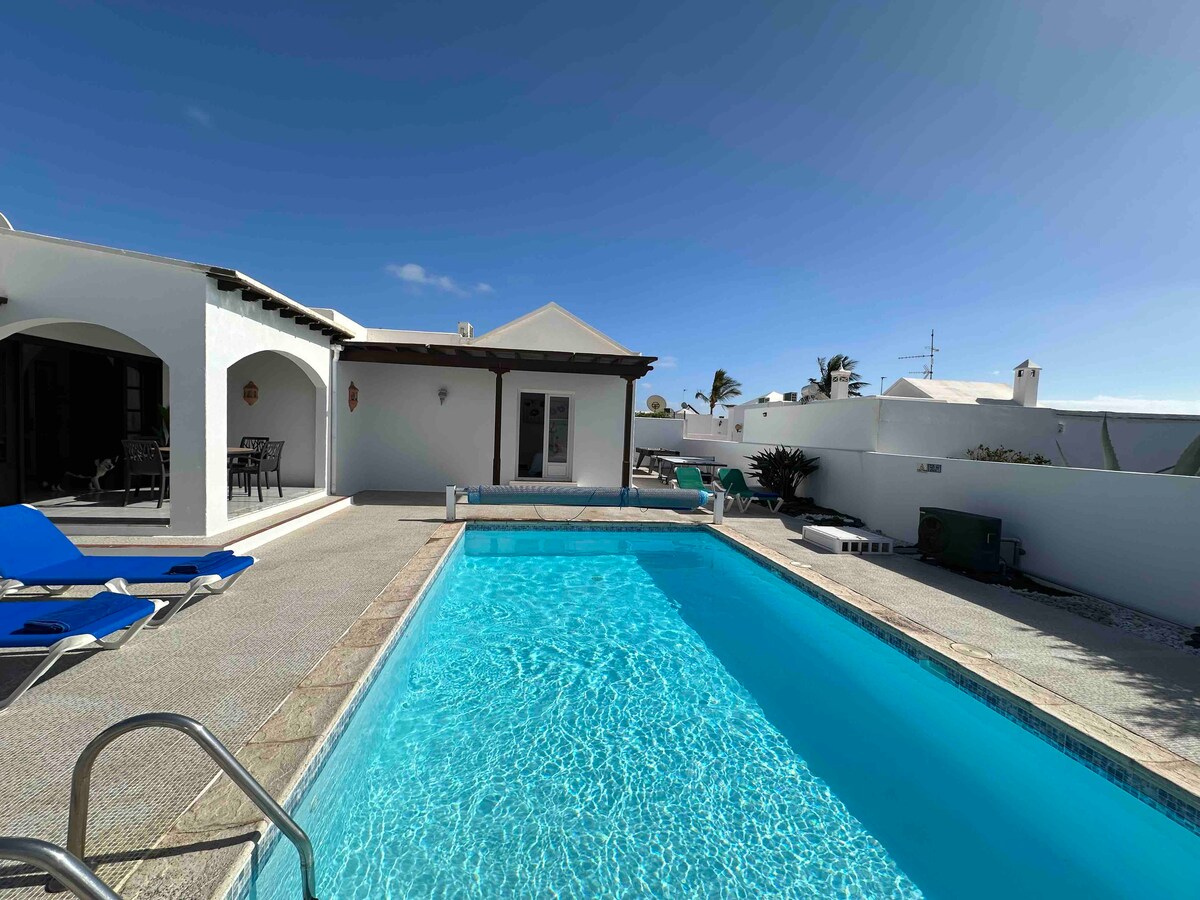 Casa Las Claras dispone de tres habitaciones dobles, dos de ellas con camas de matrimonio y la tercera con dos camas individuales, cada habitación dispone de baño propio, también un salón, cocina y un patio canario en el interior. En la zona exterior disponen de aparcamiento privado, jardines, rincones de ocio y lectura y una gran terraza donde hay ubicada una piscina. Aunque parezca grande, la casa puede adaptarse de forma muy acogedora para dos personas y sentirse como en casa. Sin embargo, no se aceptan reservas para las celebraciones de eventos especiales ni se permiten fiestas. También comentar que nosotros, los anfitriones, vivimos al otro lado de la casa, compartimos con nuestros clientes la terraza de la piscina, y aunque realmente no la usamos si hay clientes haciendo uso de ella necesitamos pasar por esta zona para entrar y salir de nuestra casa. Es ideal para los niños, tienen alrededores donde correr, jugar, así como un rincón con arena de playa. En la casa hay televisión por satélite, DVD, cambio de toallas al tercer día, servicio de lavadora para estancias de más de una semana,..... Lejos del ruido mundanal del turismo de masas está situada en el pueblo de Tías, el lugar es muy tranquilo y con muy fácil acceso al centro del pueblo, caminando pueden estar allí en diez minutos y pueden encontrar supermercados, restaurantes, cafeterías, farmacias, centro de salud, y como no, La Ermita de San Antonio donde habitualmente hay bonitas exposiciones de pintura, escultura, ..... Para disfrutar del campo que nos rodea, justo detrás de la casa hay una serie de senderos, incluidos dentro de la red de senderos insulares, y que les puede hacer disfrutar de unas maravillosas vistas y un agradable paseo. También pueden encontrar parada de transporte público a menos de cinco minutos. Desde este lugar la visita a la isla se hace fácil, casi en el centro el trayecto más largo se hace en 30 minutos en coche. Las playas más cercanas, Pto. del Carmen a donde se llega en 10 minutos y las playas de Papagayo, 30 minutos, playas ideales de arena dorada . En fin, les invitamos a que nos conozcan, disfruten de un lugar acogedor y donde el canto de los pájaros será parte de su compañía durante su estancia.