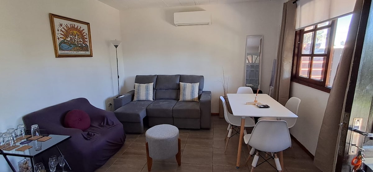 ¨Viento Azul¨ es una casita ubicada en la zona de La Barra, a 10 km de Punta del Este. Check -in 15:00 pm / Check out - 11:30 pm Capacidad para 3 personas. Servicios incluidos: ropa blanca para estadías cortas, secador de cabello, jabón líquido y ph. Cocina totalmente equipada Living -comedor (Tv cable, Netflix, Aire A 12 btu, sofá cama, Wi-fi 5G) Dormitorio en suite: Sommier Queen, A.Acond. 12 btu, Tv cable, Netflix y caja fuerte. Parrillero con mesa y sillas. Amplio jardín verde