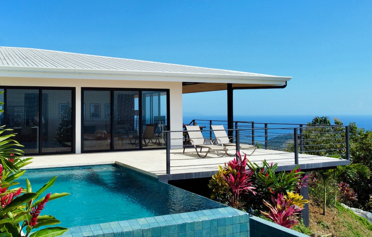 La paz y la tranquilidad te esperan en esta lujosa villa española con vistas al océano Pacífico y al dosel de la selva que hay debajo. Preciosa casa personalizada de 4 dormitorios y 3 baños completamente renovada con maderas duras y piedra locales. ¡Las brisas de la montaña y las vistas épicas te dejarán sin aliento! Ubicada en el corazón de una de las siete zonas azules del mundo, tu estrés y preocupaciones se desvanecerán en el momento en que llegues. Hay vistas desde todos los niveles y muchos espacios para relajarse y rejuvenecer. ¡A solo minutos de la impresionante playa de Carillo!