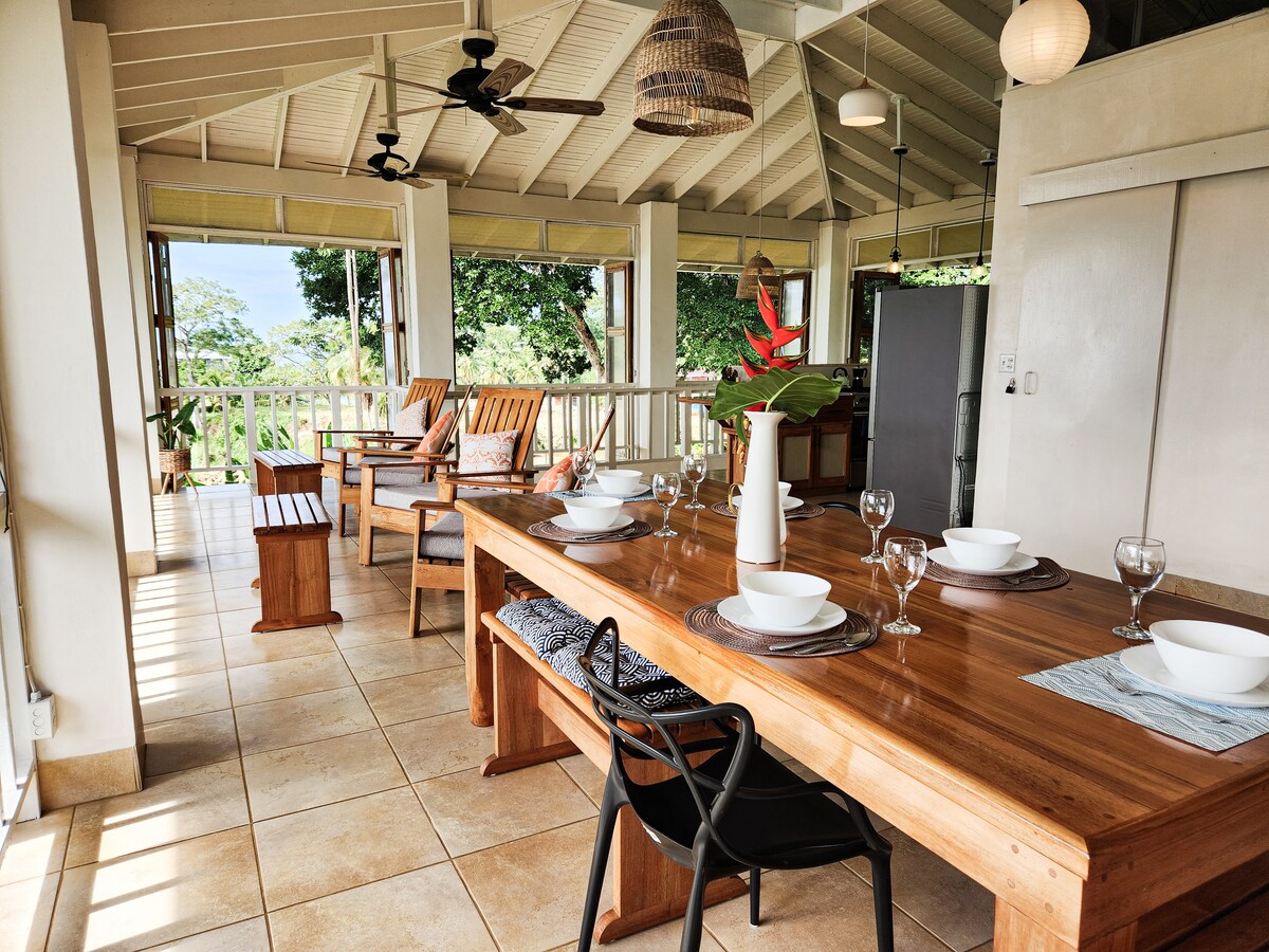 Disfruta de tu propia terraza con jardín tropical en Purple House - Over The Water Rentals. Tu hogar lejos de casa en el paraíso. Las vistas de la bahía se pueden disfrutar desde la terraza comunitaria al atardecer o relajarse en la terraza cubierta del jardín con sofá, mesa de comedor y hamacas. Tenemos equipo de esnórquel, kayaks y tablas de surf de remo para usar gratis. Cerca de la ciudad/aeropuerto en un barrio local rústico y seguro. 2 dormitorios dobles con aire acondicionado, ducha de agua caliente, jabón orgánico hecho a mano, cocina equipada y wifi de alta velocidad.