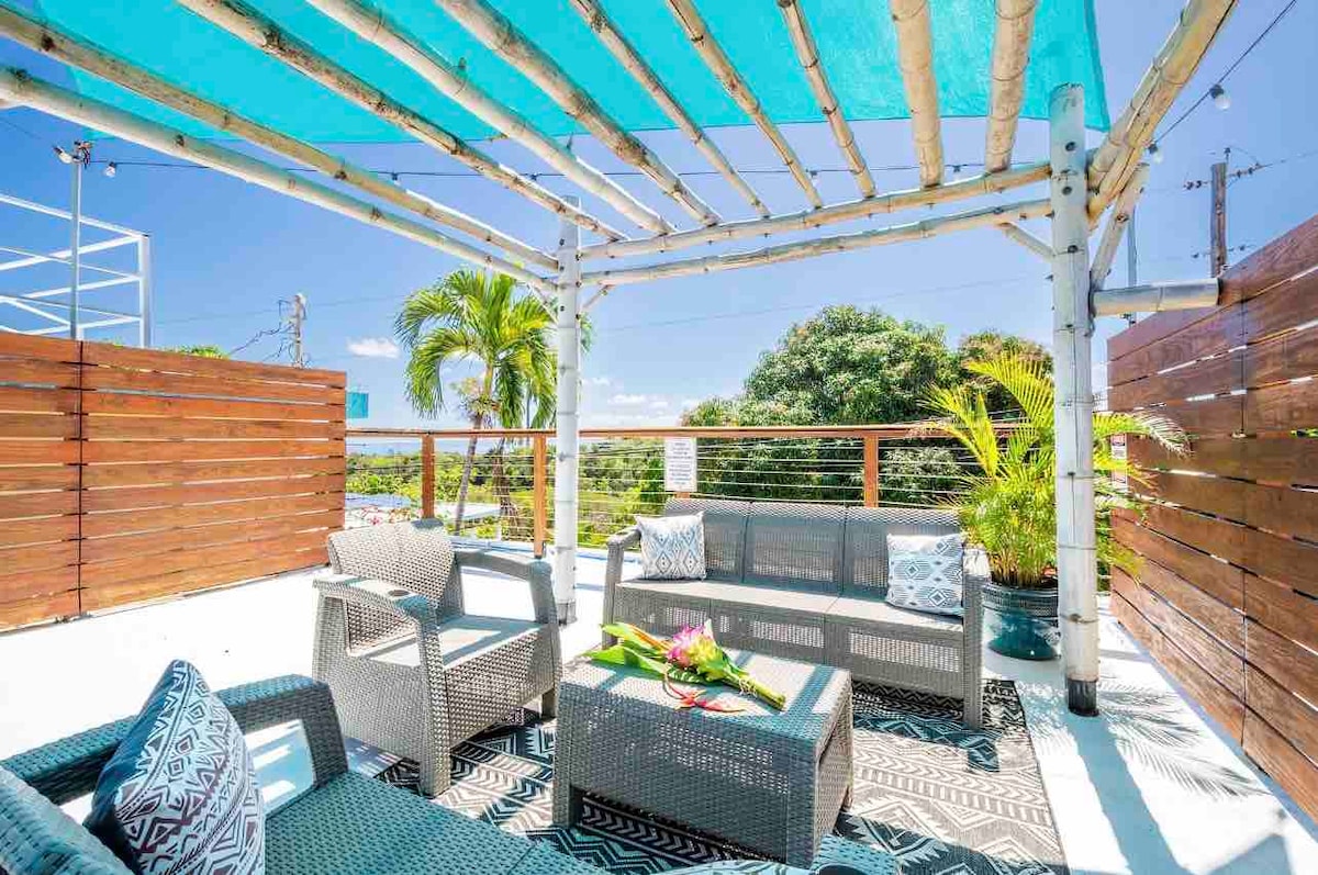 Villa de surf en Rincón: pérgola en la azotea y vistas al mar