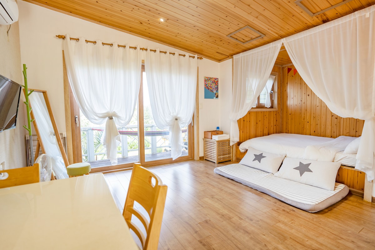 "Staydorangshi 502" es un alojamiento para hasta 5 personas que es ideal para viajar al este de Jeju, incluidos Songdang, Pyeongdae, Sehwa, Woljeong y Seongsan. Los principales destinos turísticos del este, restaurantes y cafeterías están a 10-20 minutos en coche, Bijarim a 1 minuto en coche y un minimercado a 1 minuto a pie. Es básico que la pareja anfitriona limpie cada rincón sin dejar ningún lugar sin limpiar, y lava y seca las sábanas y toallas que se cambian con cada reserva. El dormitorio espacioso tiene una cama queen y ropa de cama en el armario empotrado, por lo que puedes dormir en el suelo con tu bebé/perro, y el acogedor ático tiene 2 camas individuales y un proyector de luz, para que cualquiera pueda disfrutar del romance de ático con el que sueña. Hemos preparado cuidadosamente muebles, electrodomésticos y pequeños accesorios para el hogar para que pueda usarlos como en su propio hogar, así que me gustaría que vinieras con tu familia, amigos, bebés y perros y te quedaras cómodamente.
