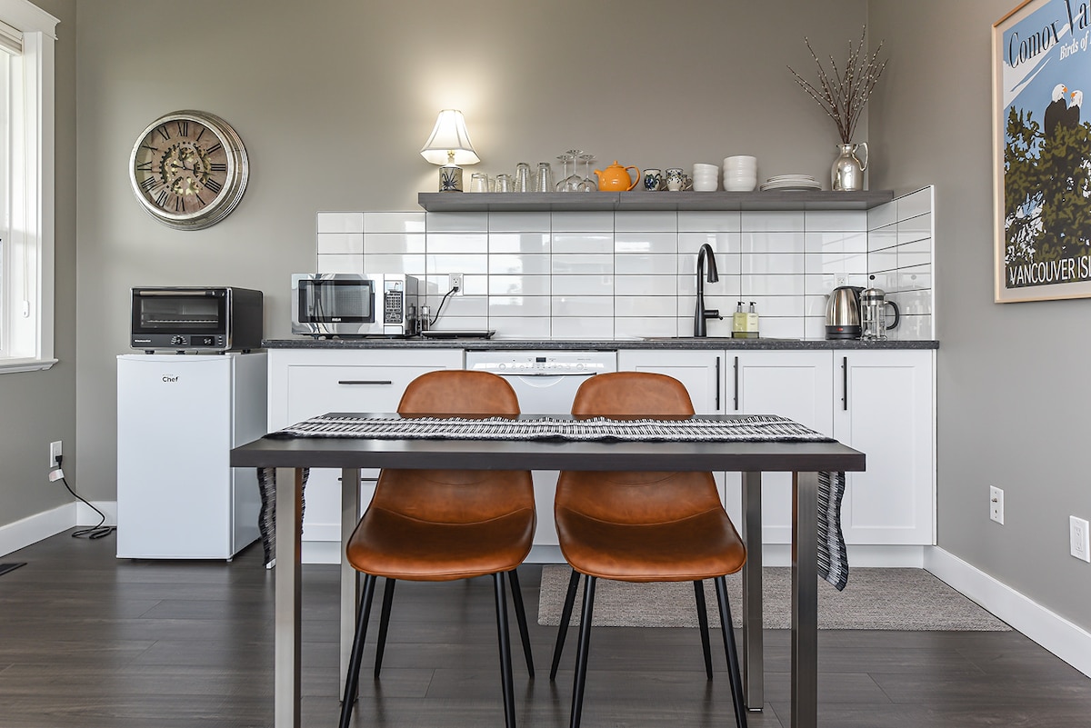 Tu propio paraíso. Esta suite independiente, de concepto abierto y con cocina americana ofrece una cocina totalmente equipada, barra para comer, baño con ducha y cama tamaño queen. Nuestros huéspedes disfrutarán de los magníficos amaneceres y, al final del día, podrás hacer una barbacoa mientras contemplas cómo la luz del atardecer toca las montañas costeras. Cerca de todos los servicios, a pocos pasos de la playa. Suaves brisas marinas y la máxima privacidad te esperan. El lugar perfecto para relajarse o explorar el valle de Comox.