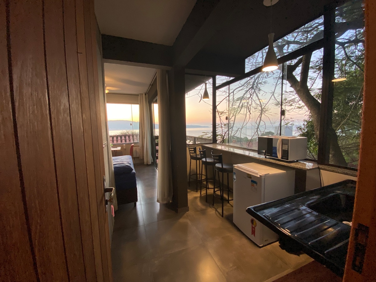 Apartamento ESTUDIO con balcón, increíble vista al mar, ideal para una pareja, cocina compacta, barbacoa en el área común. El departamento está en una calle tranquila. Estamos a 350 metros de la playa, a 900 metros de la playa de Sepultura y a 900 metros del centro de Bombinhas. Cerca de mercados y restaurantes. Aire acondicionado split, wifi, baño privado.