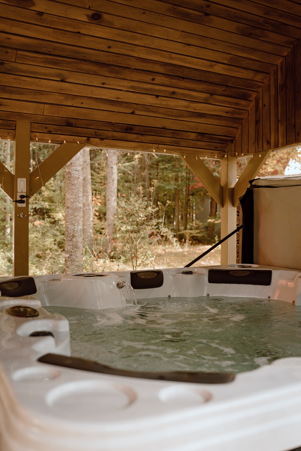 Disfrute de una casa de campo amplia y cálida con spa privado cubierto y una chimenea interior para noches de mimos. Diviértete alrededor de la mesa de futbolín. Invierno: senderos para raquetas de nieve, tobogán Verano: senderismo, lago para nadar, lago de pesca, playa, módulo de juegos, canoa, bote a pedales ***Traiga sus toallas para el spa*** No se admiten animales, toque de queda a las 23:00 Aire acondicionado, barbacoa y zona de comedor al aire libre en verano Capacidad máxima: 8 personas Estancia mínima: 2 noches