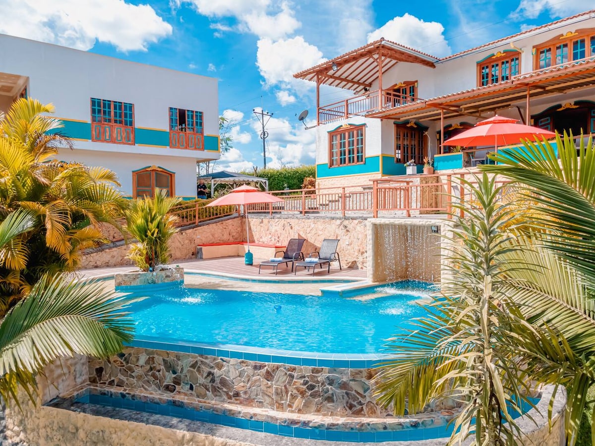 Sumérgete en la comodidad de esta casa de campo, de 2 cuartos y 2 baños para 8 personas en el corazón del Eje Cafetero, a pocos minutos del Parque del Café y Panaca. Aquí tendras los momentos más agradables donde la tranquilidad se combina con vistas de película al bosque. Servicios que harán tu estadía maravillosa: ✔ La casa es exclusiva para ti, no se comparte ✔ Diseño icónico ✔Jacuzzi ✔ Piscina infinita ✔ Cocina equipada ✔ Deck ✔ Wi-Fi Starlink High Speed ✔ Desayuno opcional ✔ Pet friendly